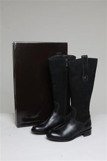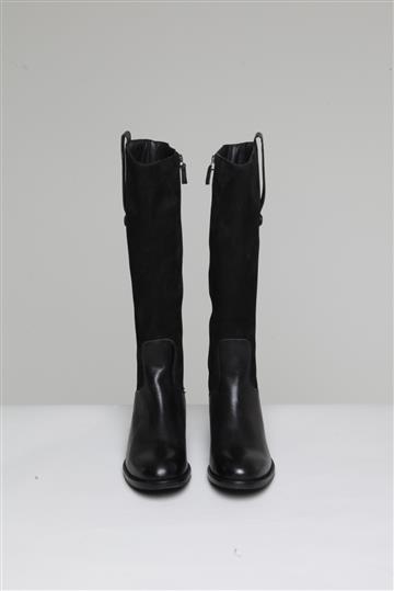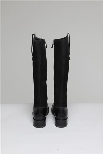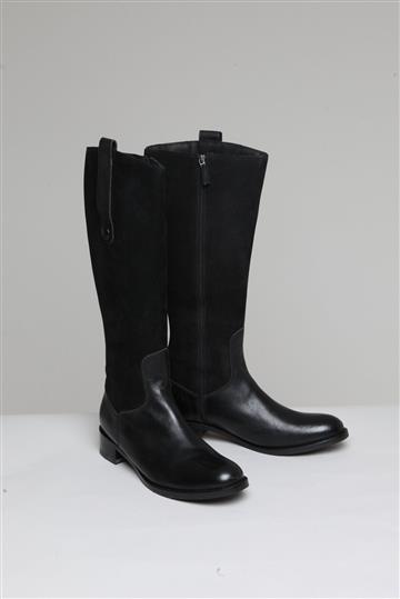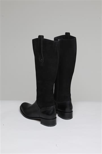 - Bota em couro liso e encorpado com detalhes em camurça