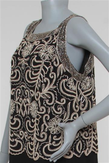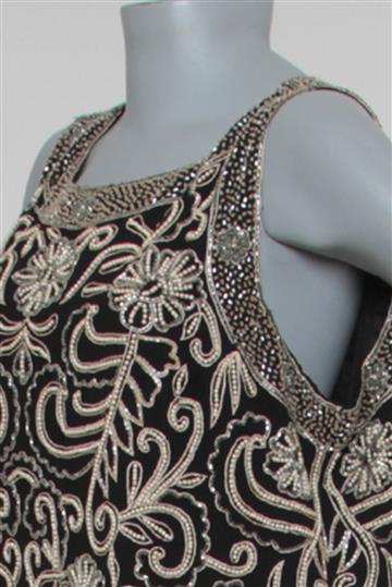 - Bordados superiores estilo paisley com pérolas e canutilhos aplicados