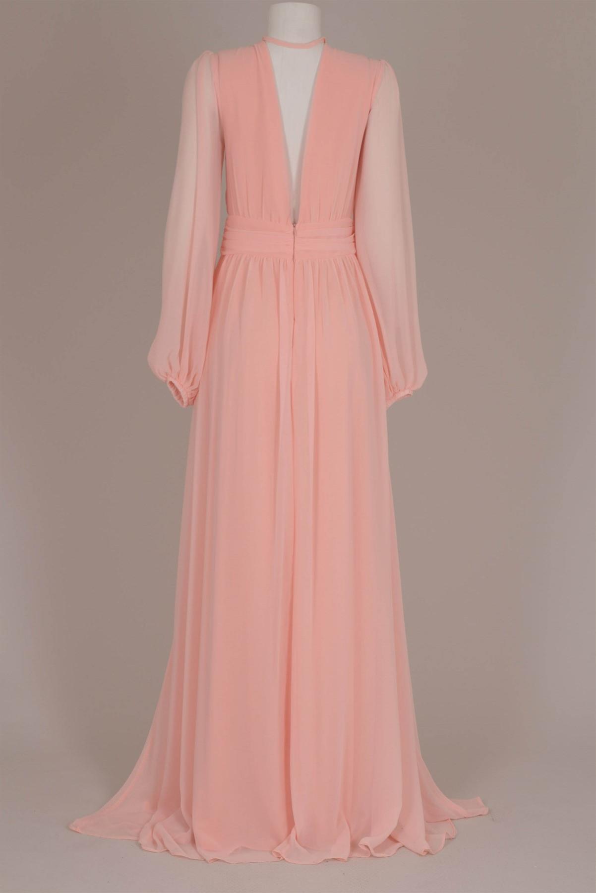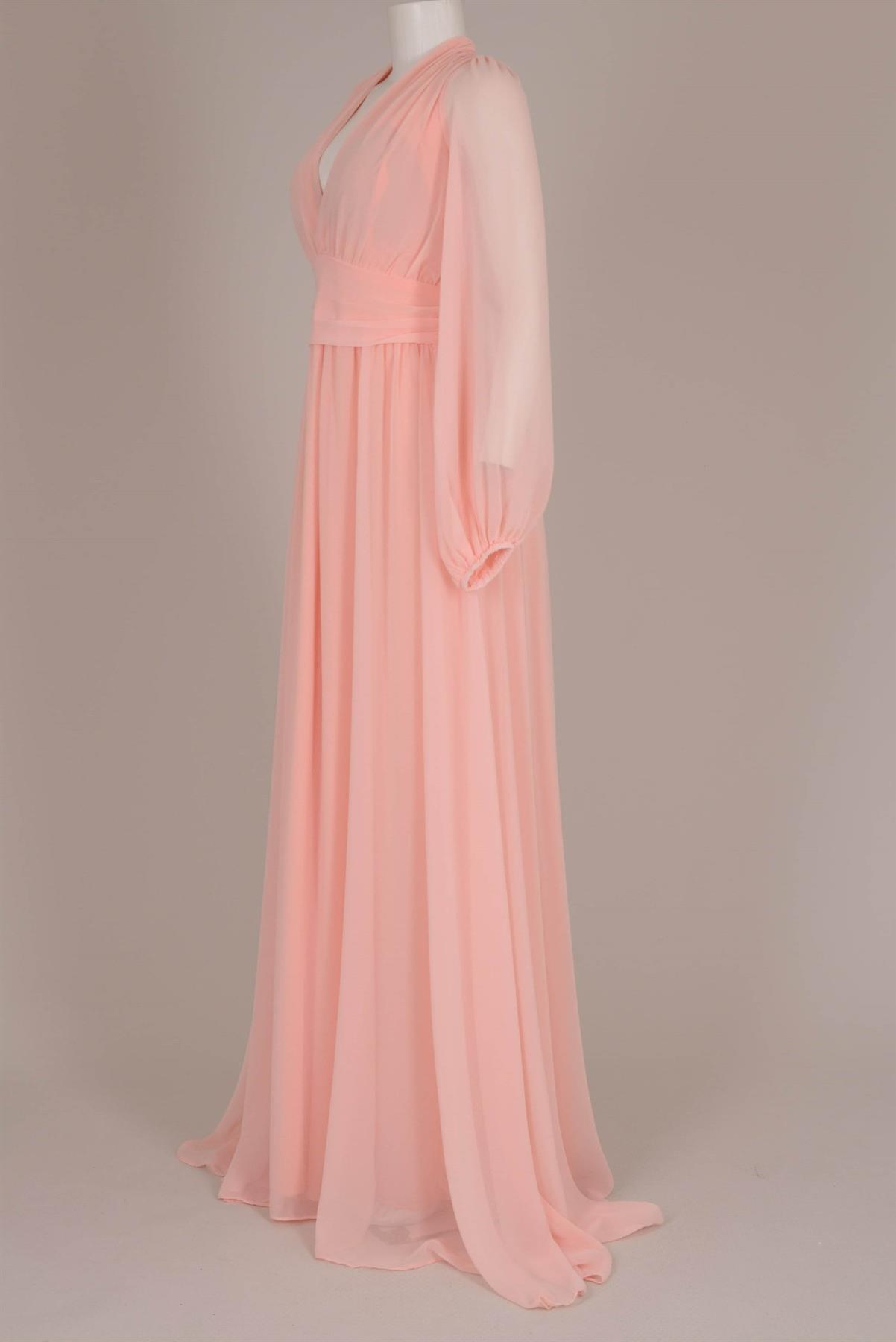 - Vestido de festa de poliester- Longo- Decote em 'V'- Bojo no busto- Manga longa bufante com elástico- Saia e sobresaia com abertura lateral- Caimento fluido- Fechamento com zíper invisível nas costas