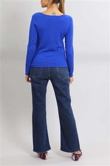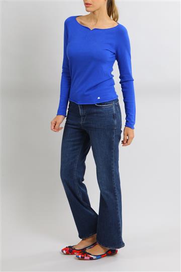 - Decote canoa amplo com pequeno recorte central em 'V'