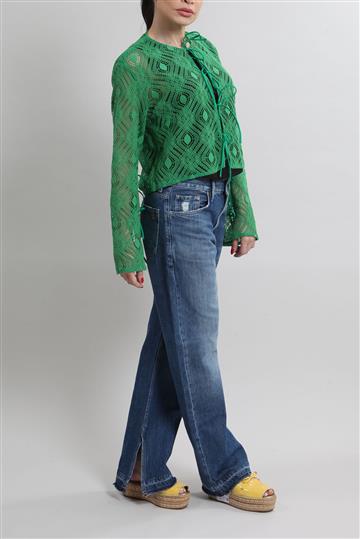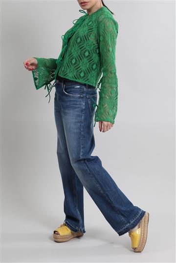 - Mangas longas retas com punhos amplos e amarração lateral decorativa