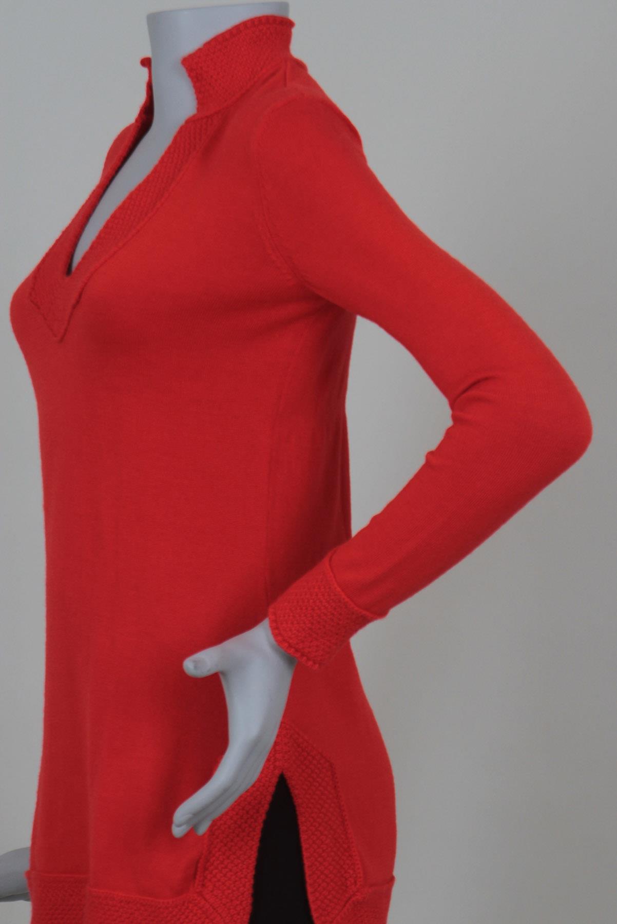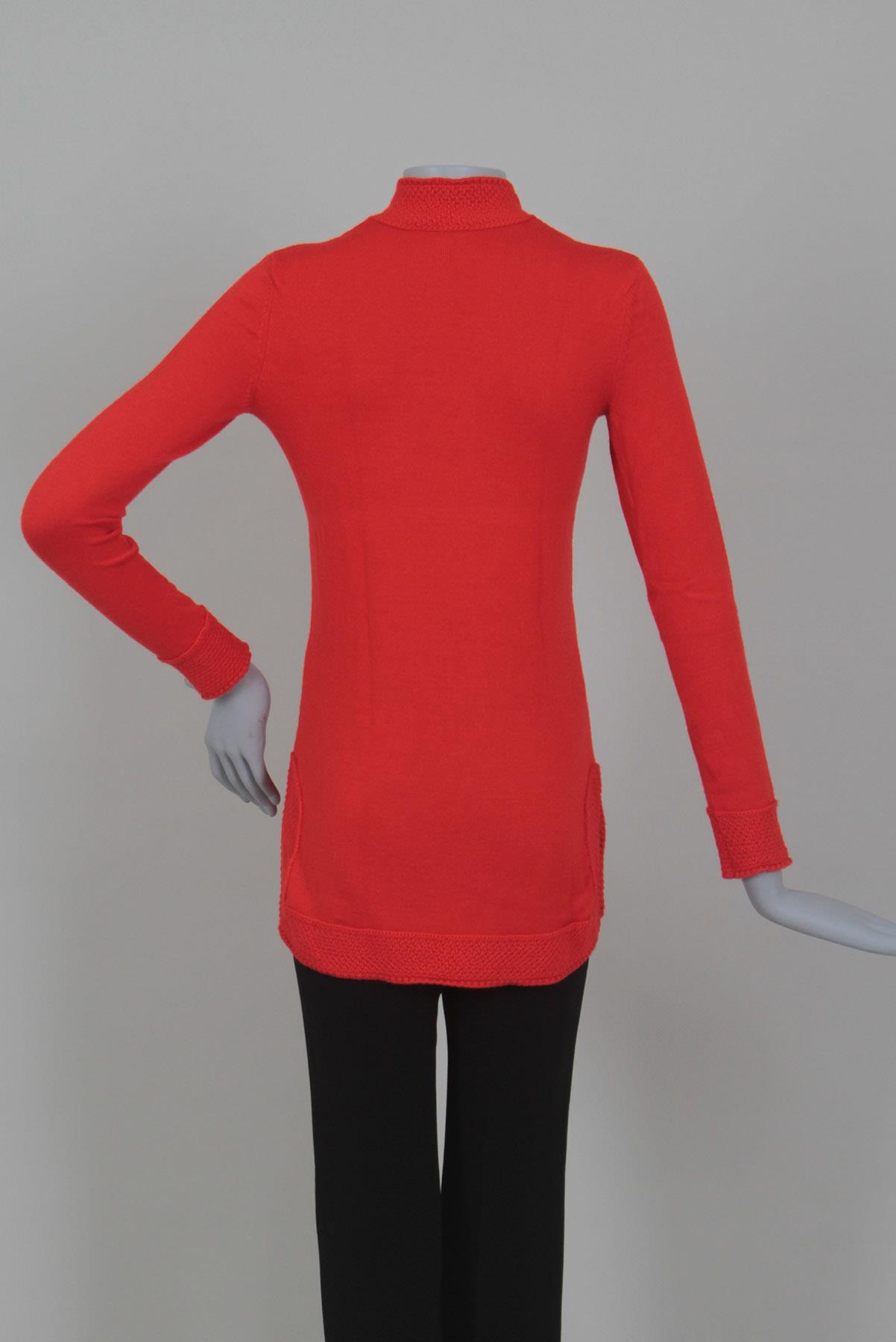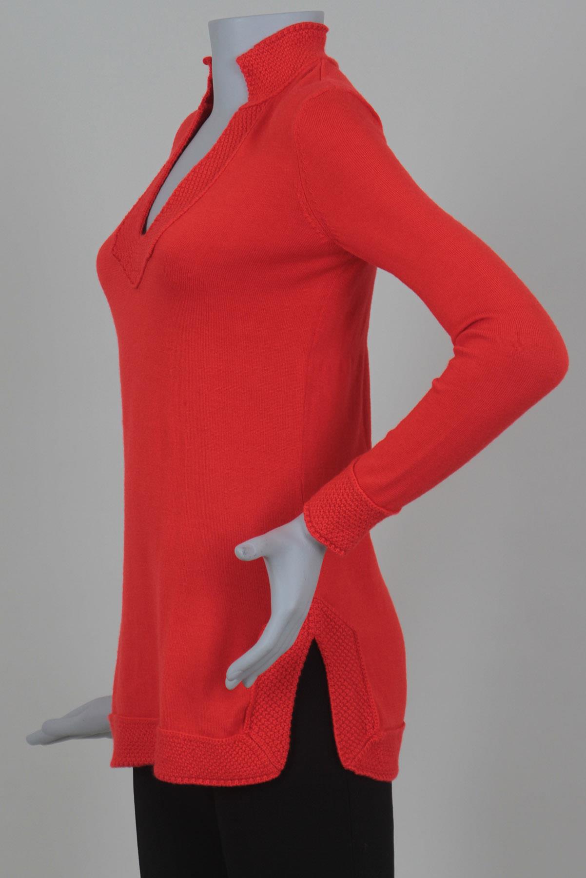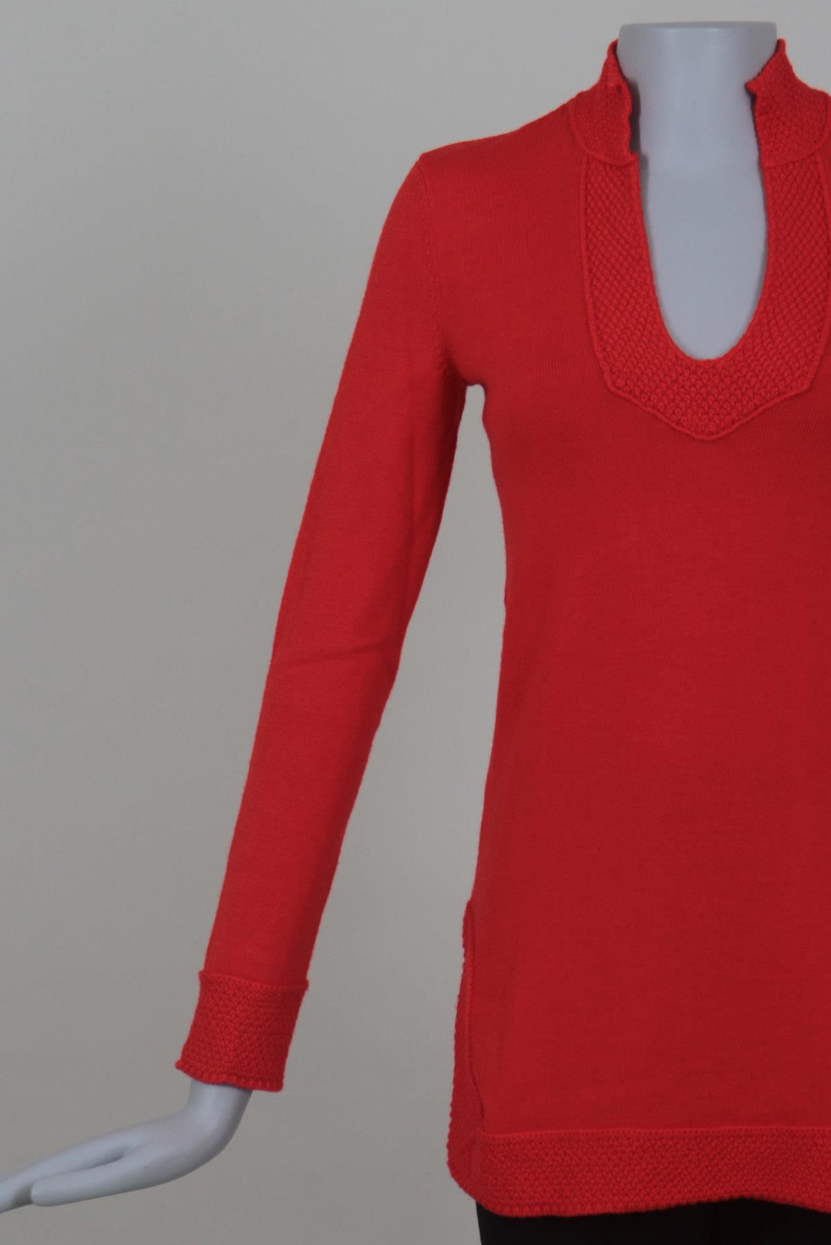 - Blusa em lã- Vermelho vibrante- Decote em 'V'- Gola alta com textura decorativa- Comprimento alongado- Modelagem justa ao corpo- Mangas longas com punhos texturizados.