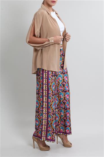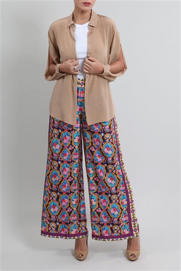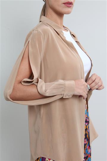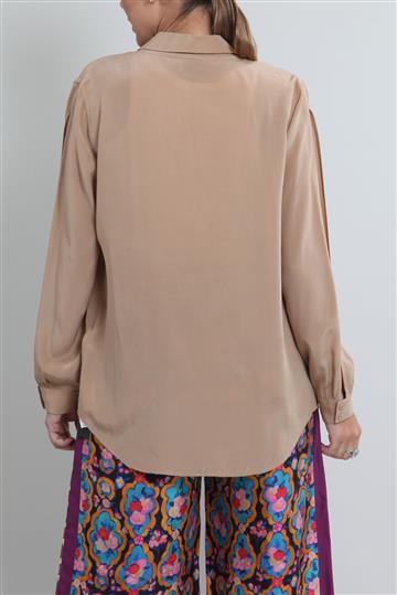 - Camisa em seda- Bege escuro- Modelagem reta levemente acinturada- Gola clássica- Mangas longas com recorte decorativo e abotoamento- Abotoamento frontal para fechamento.