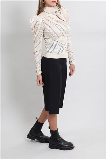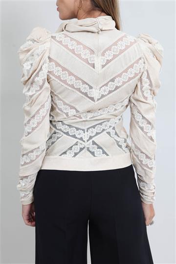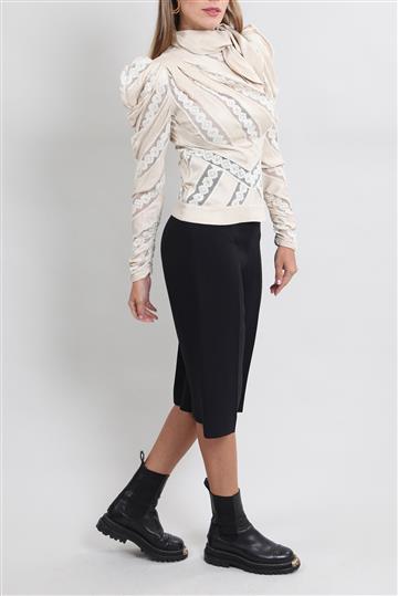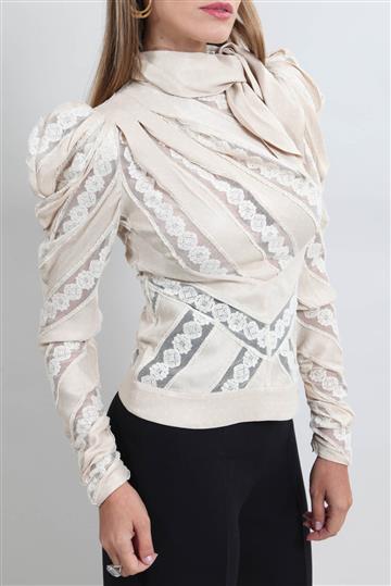 - Mangas longas com volume superior e punhos franzidos