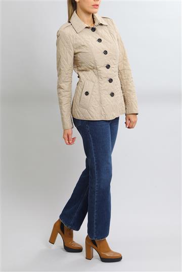 - Gola alta com lapelas de pontas clássicas e fechamento inferior com colchetes metálicos