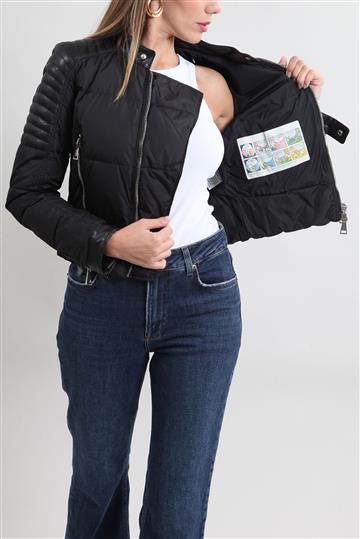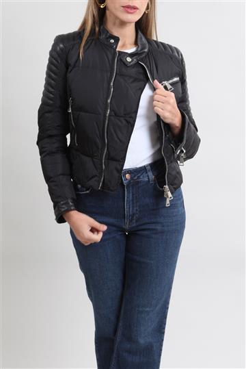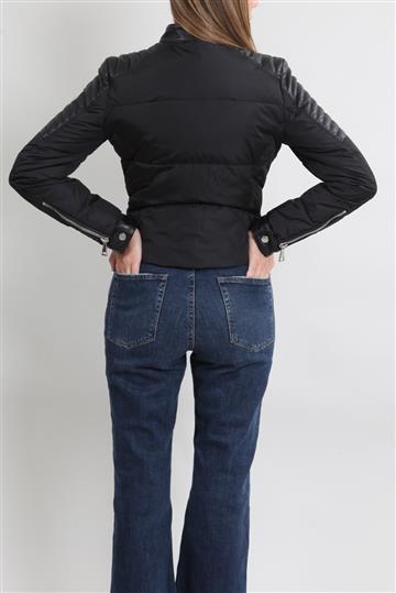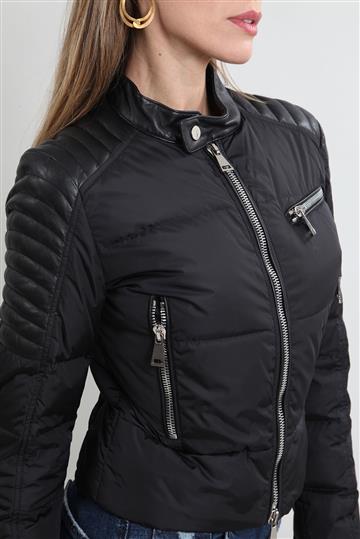 - Mangas longas retas com punhos encorpados, zíper aplicado e abotoamento