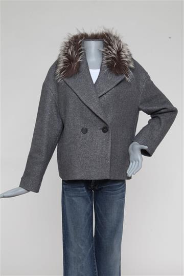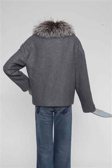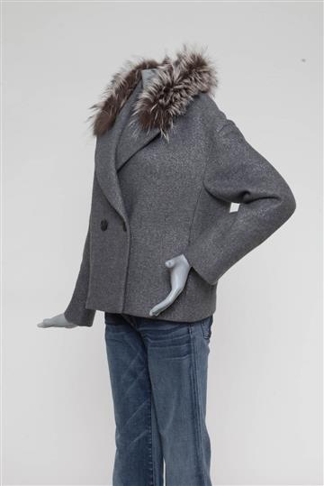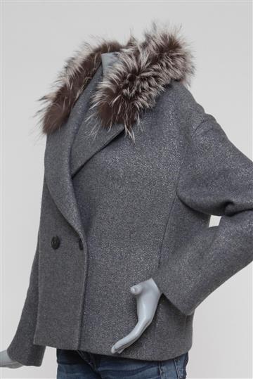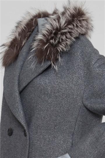 - Decote alongado em 'V' com lapelas amplas e pala de pelos removível