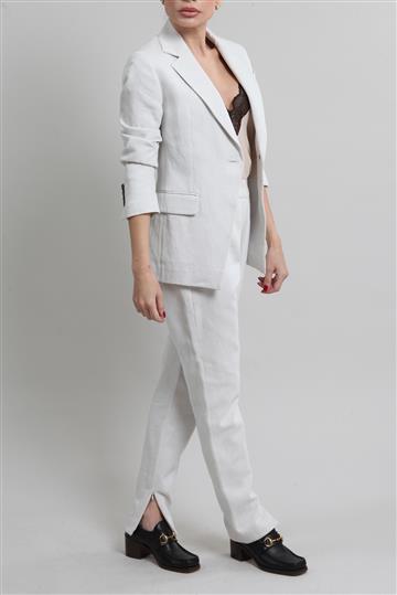 - Blazer possui modelagem reta e ligeiramente acinturada