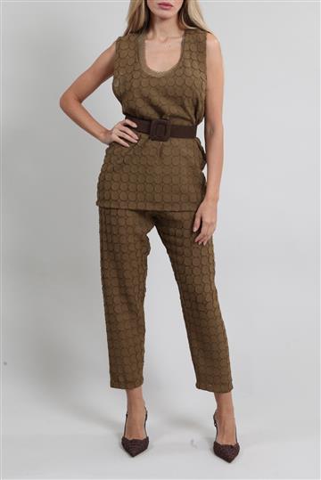 Conjunto Paula Raia Calça, Top, Regata e Cinto Camurça Marrom