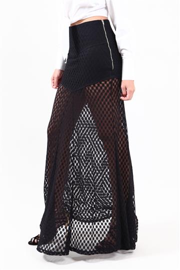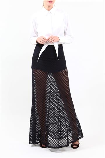 - Decote arredondado alto com pequena abertura posterior e abotoamento delicado para fechamento