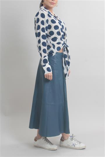 - Saia em couro liso e encorpado de toque macio com detalhes em camurça