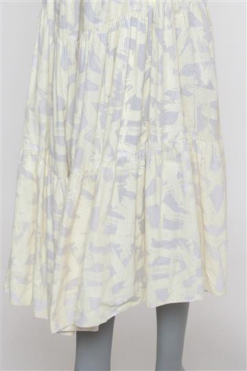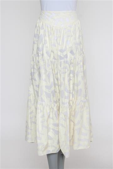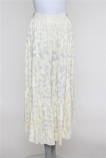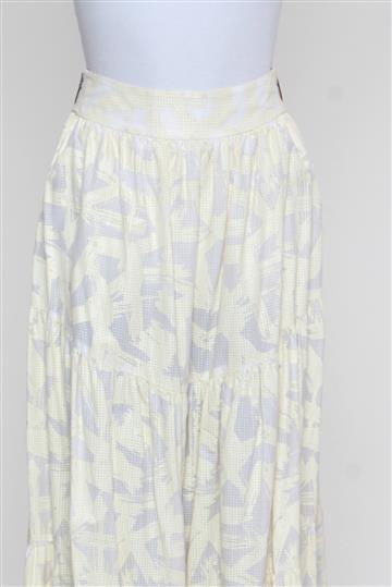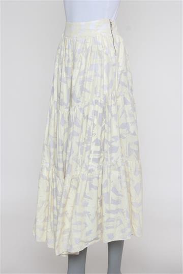 - Saia em algodão leve e texturizado- Branco e amarelo claro- Estampa abstrata total de toque emborrachado- Modelagem evasê ampla estilo 'cigana' ou 'três marias'- Cintura alta com cós reto e estruturado- Estrutura em camadas com pregas aparentes- Comprimento midi- Fechamento lateral por zíperes tratorados aplicados
