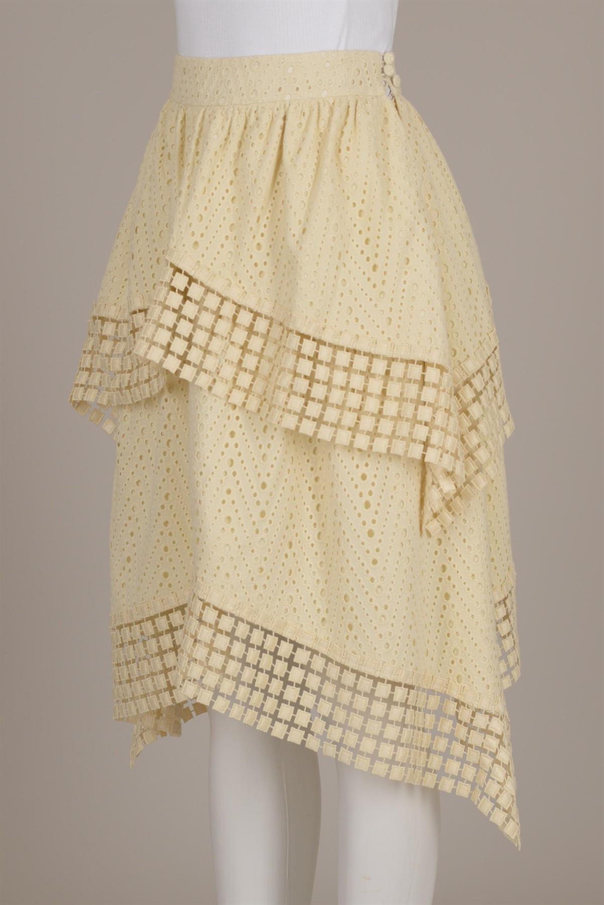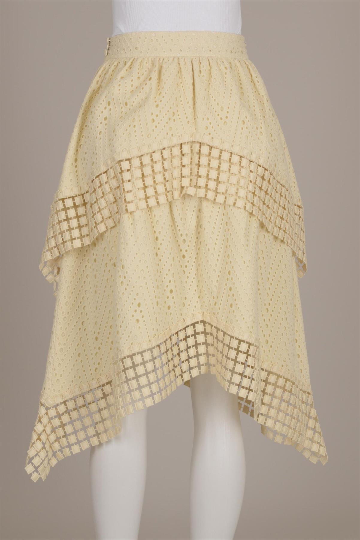 - Saia de laise- Midi- Detalhes em passamanaria- Assimétrica- Fechamento em zíper na lateral