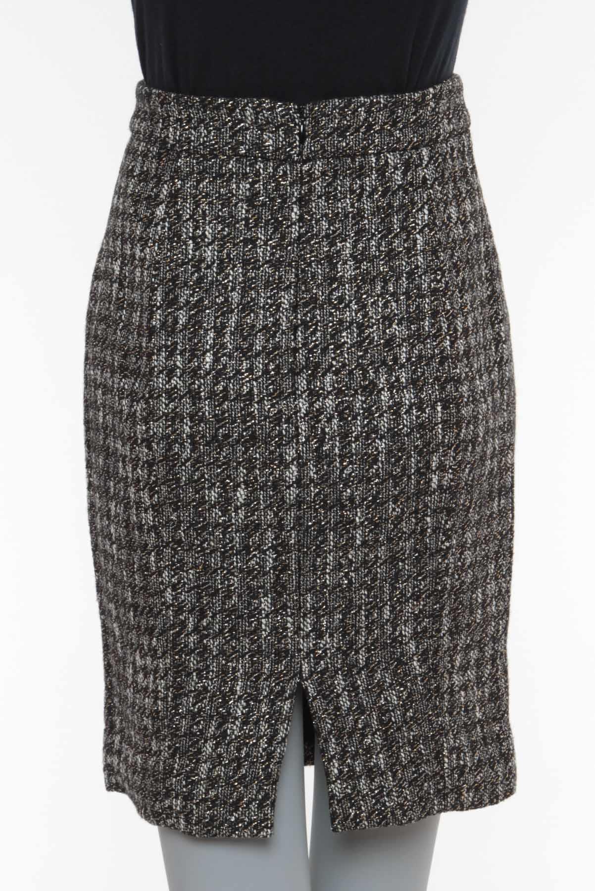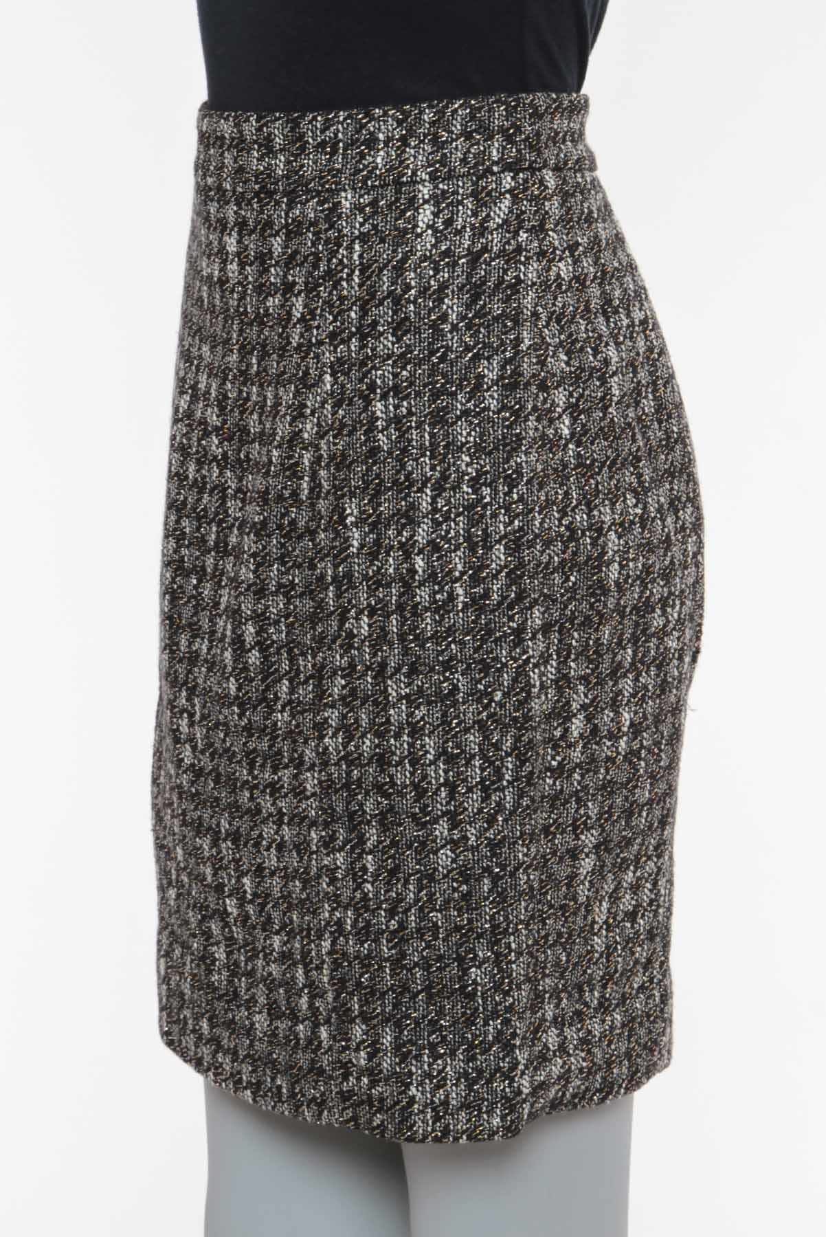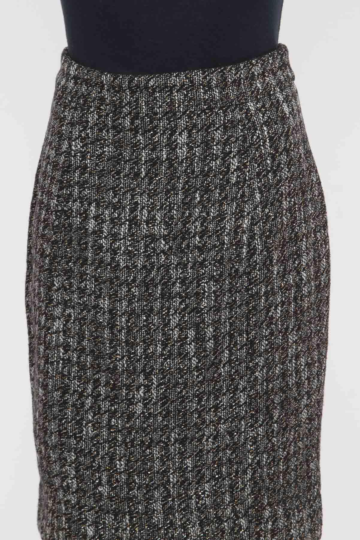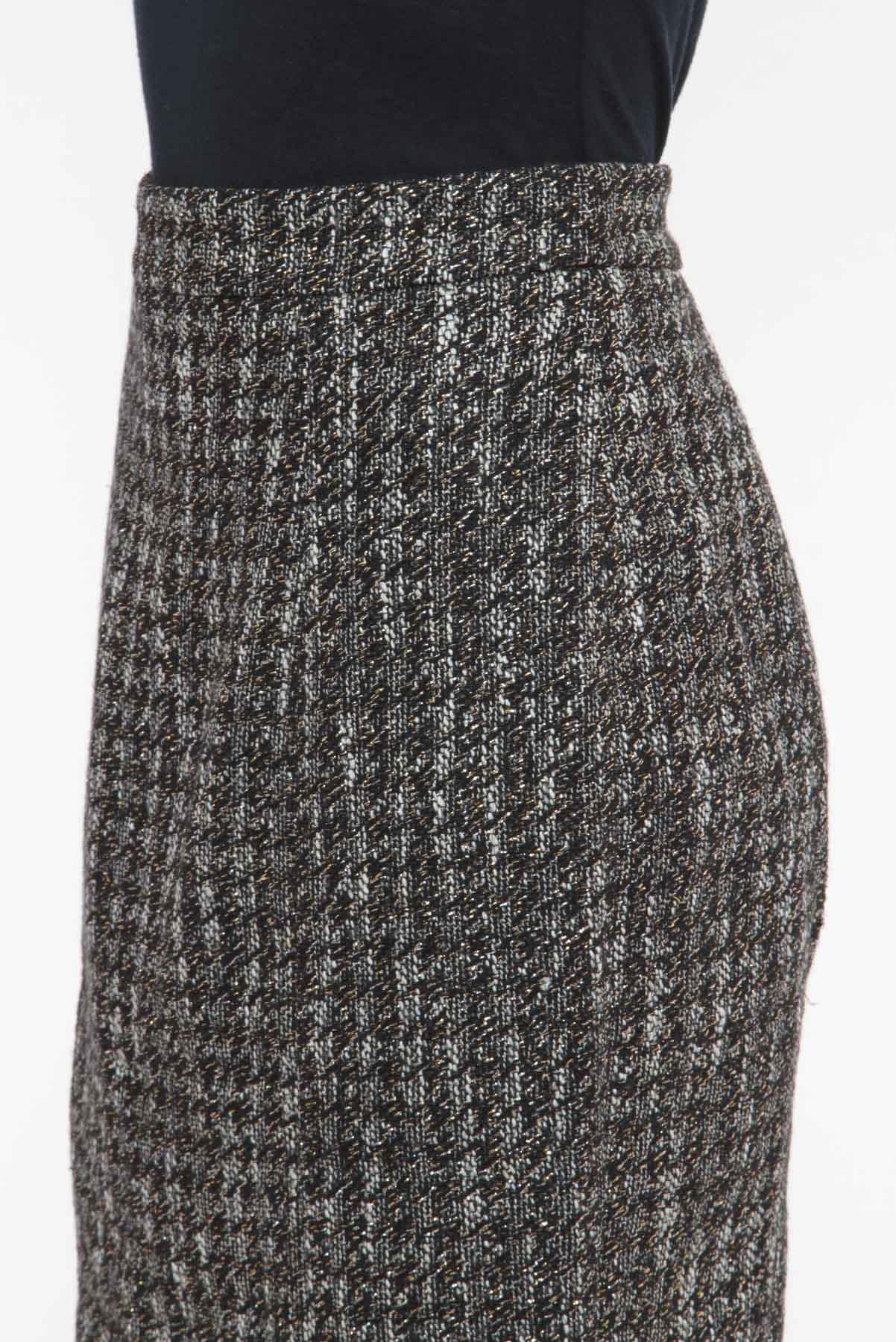 - Saia em bouclê texturizado com leve brilho- Preto e branco- Tramado total estilo pied poule- Modelagem reta estilo tubinho- Cintura alta com cós reto- Forro interno- Comprimento midi reduzido- Fechamento posterior por zíper invisível