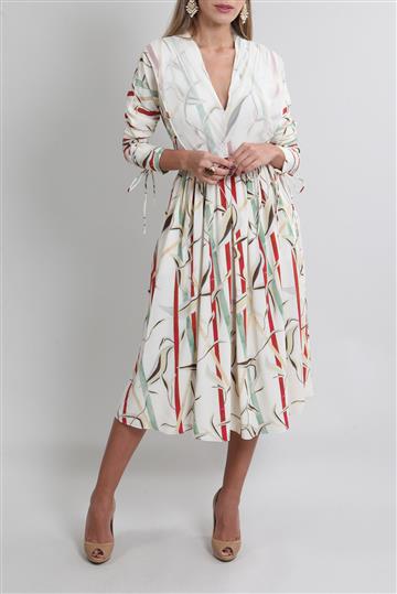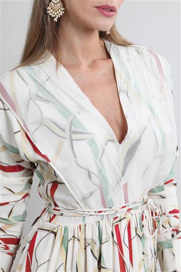 - Decote alongado em 'V' com sobreposição de pala translúcida