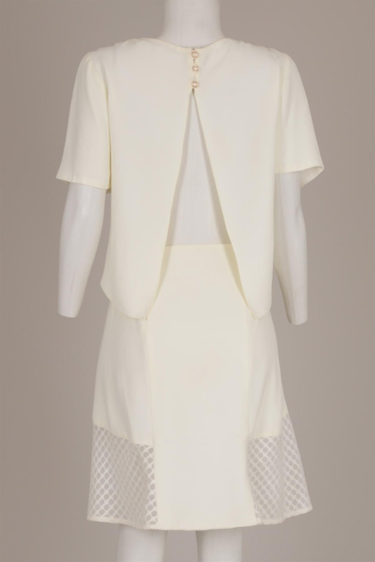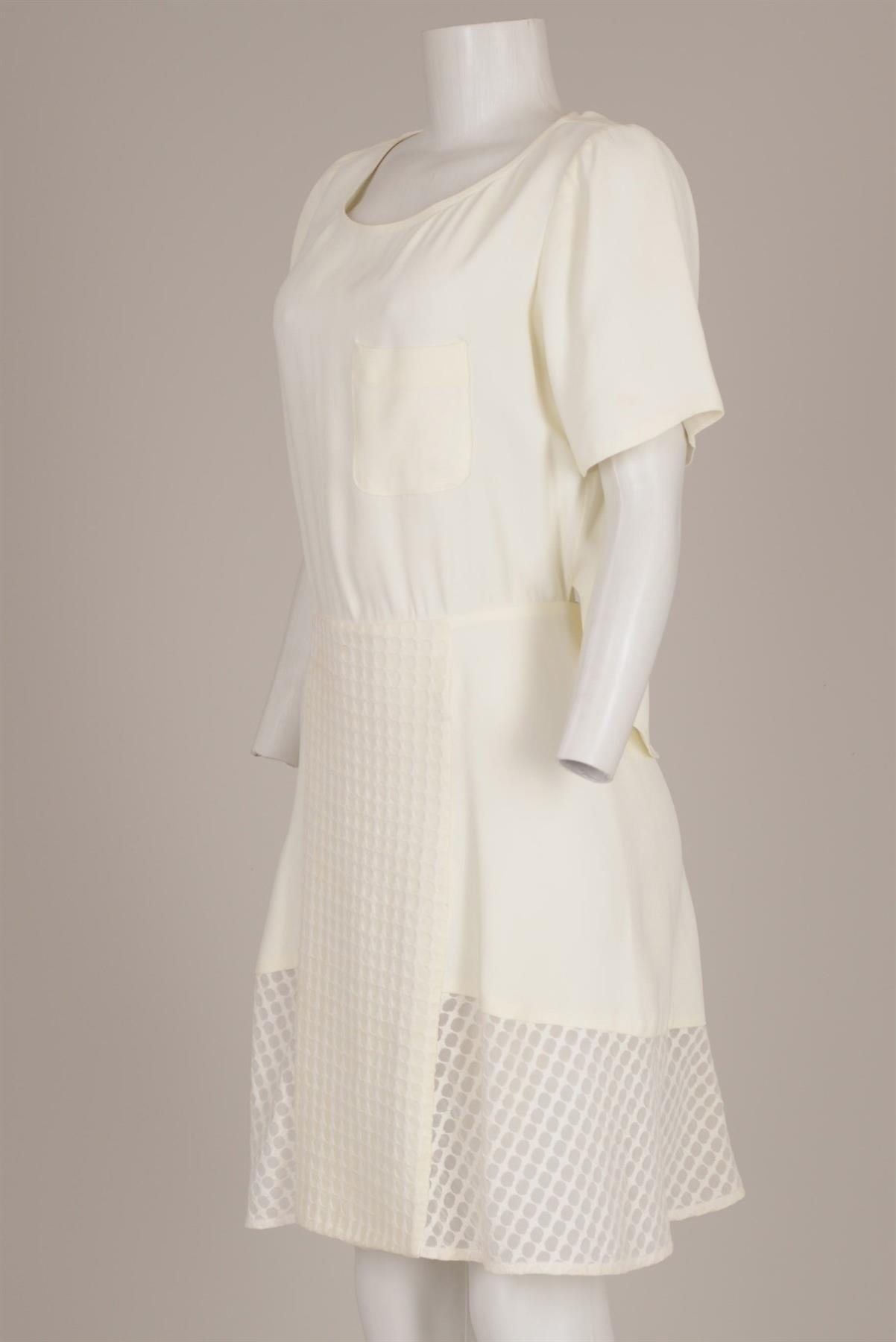 - Vestido em acetato e viscose- Comprimento no joelho- Decote redondo- Mangas curtas- Saia evasê com detalhes texturizados- Costas com abertura- Fechamento com zíper invisível na lateral
