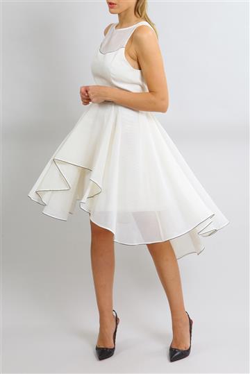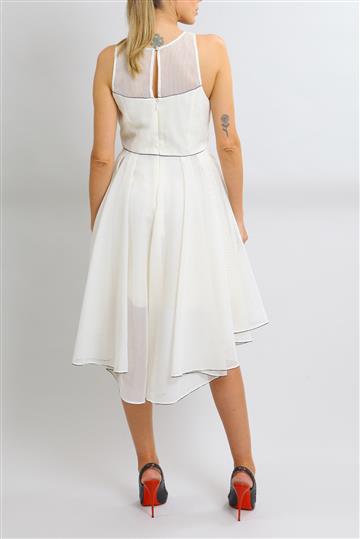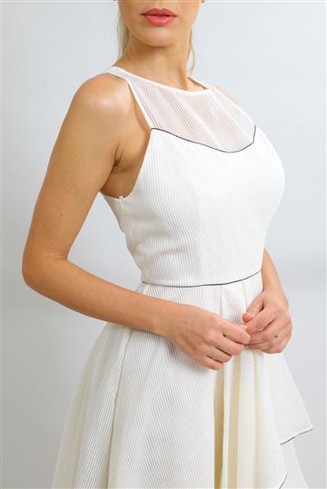 - Fechamento posterior por zíper aplicado e abotoamento delicado