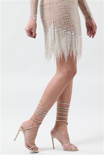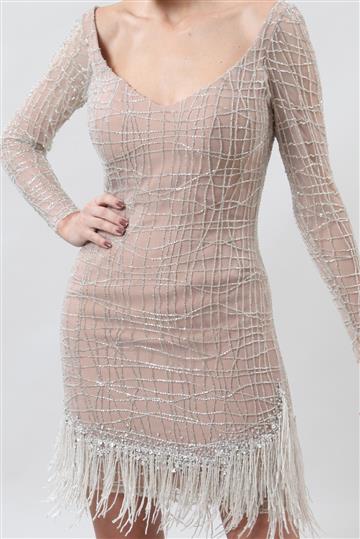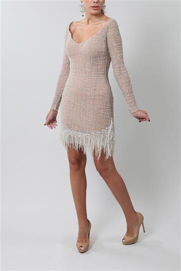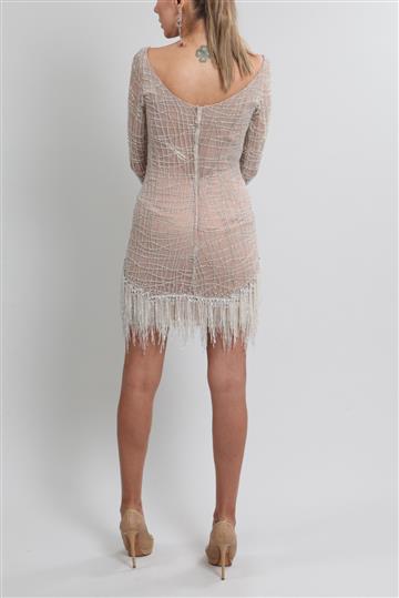 - Tramado inteiramente bordado por pequenas miçangas e canutilhos com brilho decorativo