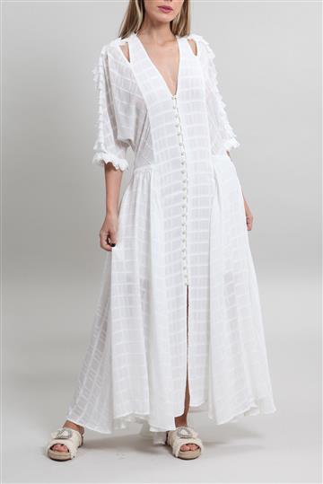 - Mangas 7/8 aplas estilo morcego com pequenos babados aplicados