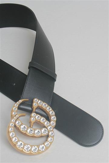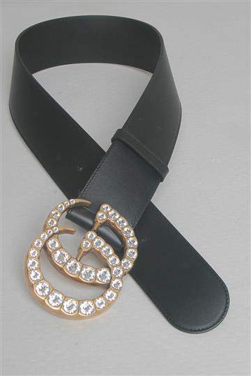 - Fivela metálica central com logomarca ampla e pedrarias aplicadas