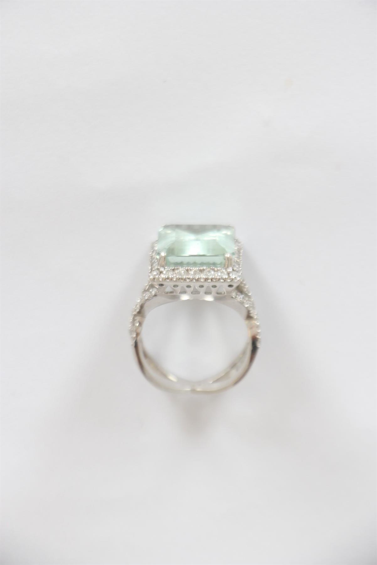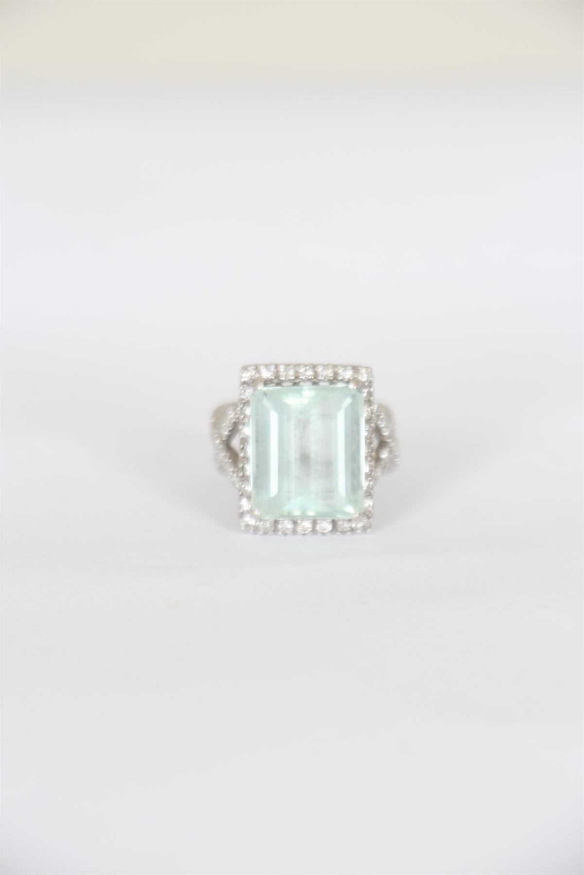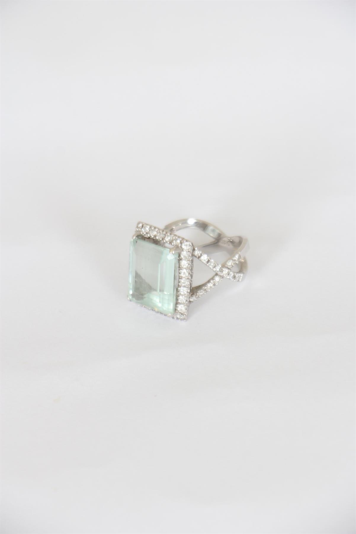- Anel em ouro branco 18k- Safira com brilhantes- Estrutura circular trançada cravejada- Garra ampla central- Pedraria retangular ampla segura por garras com pedrarias cravejadas em seu entorno