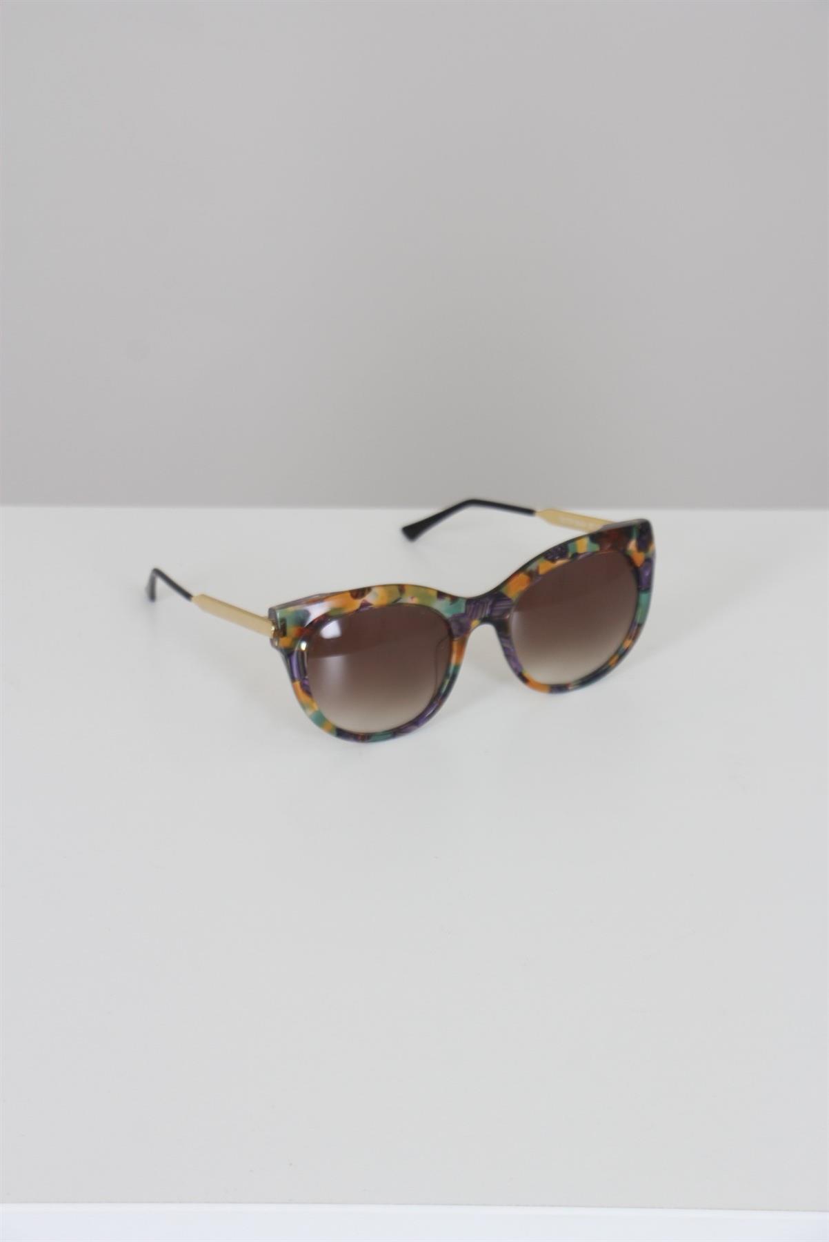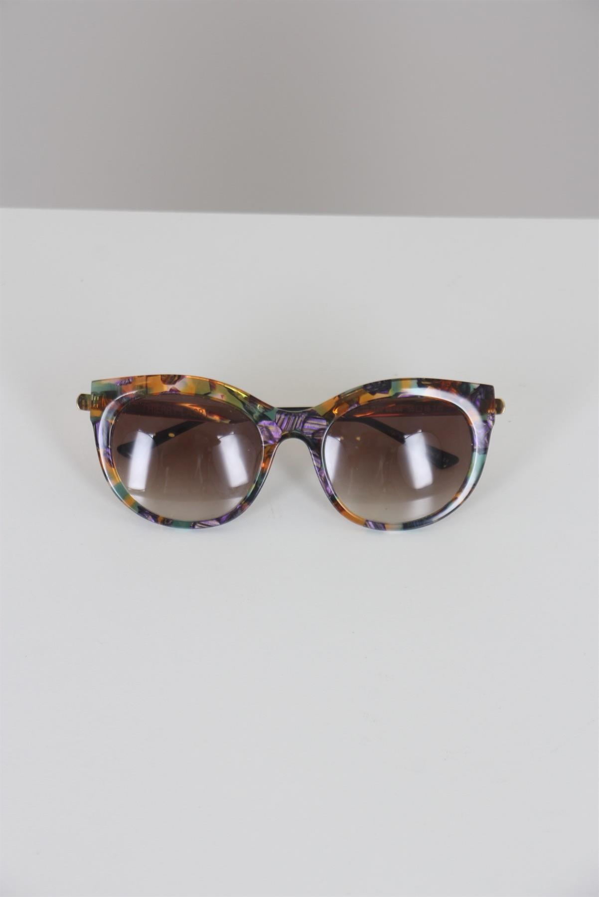 - Óculos de tartaruga- Estampado- Tons verde, ocre , lilás e marrom- Haste com detalhe dourado- Lentes marrons claras