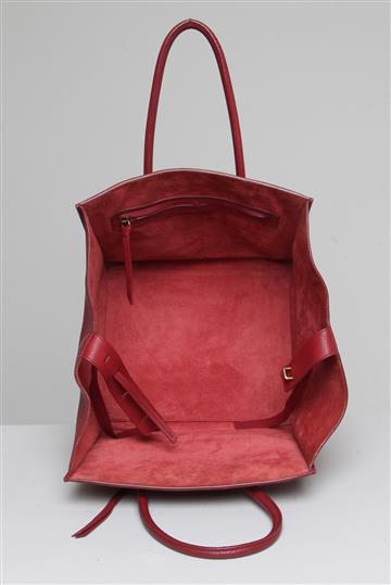 - Abertura superior com tiras de couro e passantes metálicos para fechamento