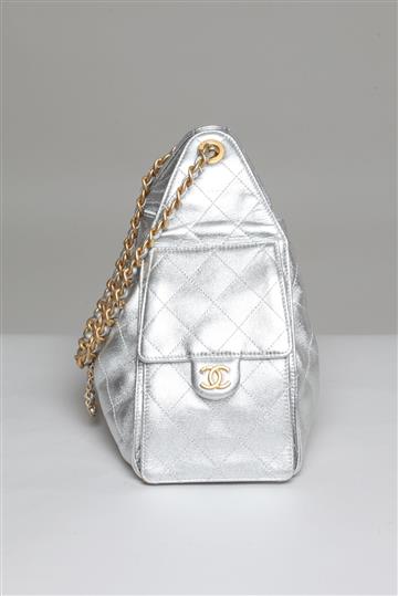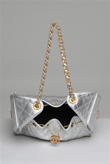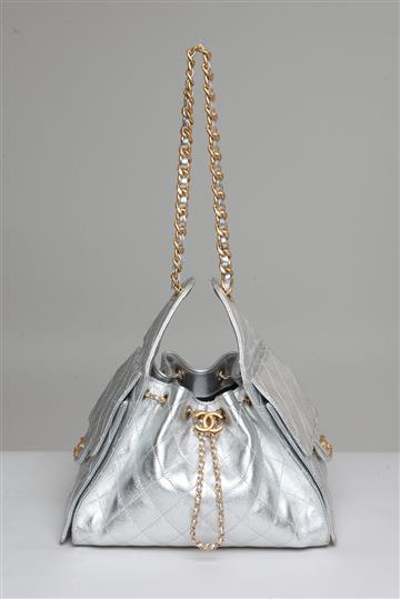 - Alça fixa e alongada para uso nos ombros composta por corrente metálica e tira de couro interna