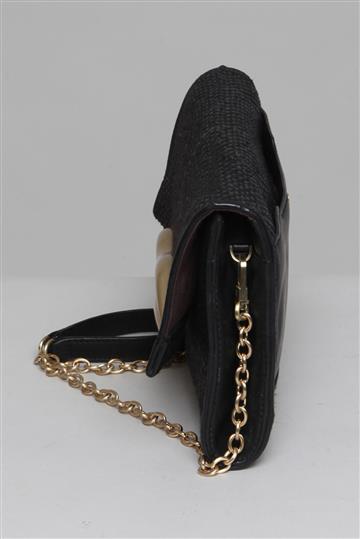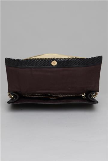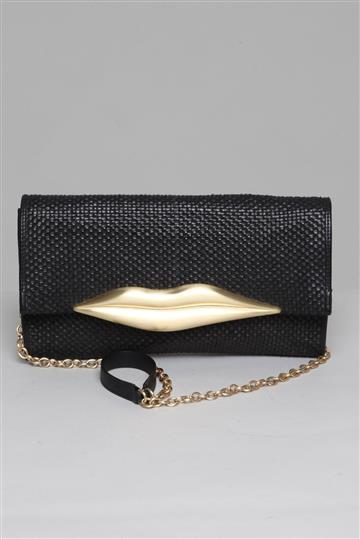 - Aba superior com grande adorno metálico em formato de boca e fecho imantado interno
