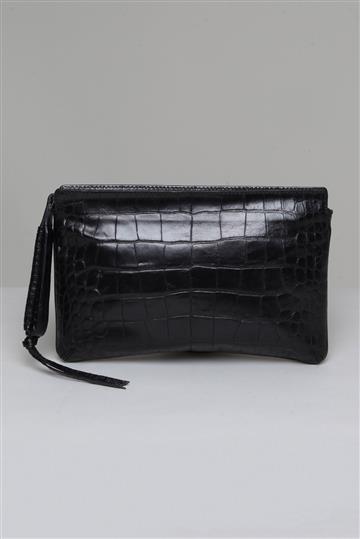 - Abertura superior com zíper aplicado e puxador ornamentado para fechamento
