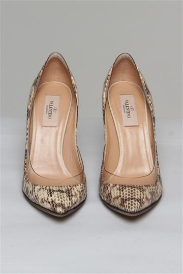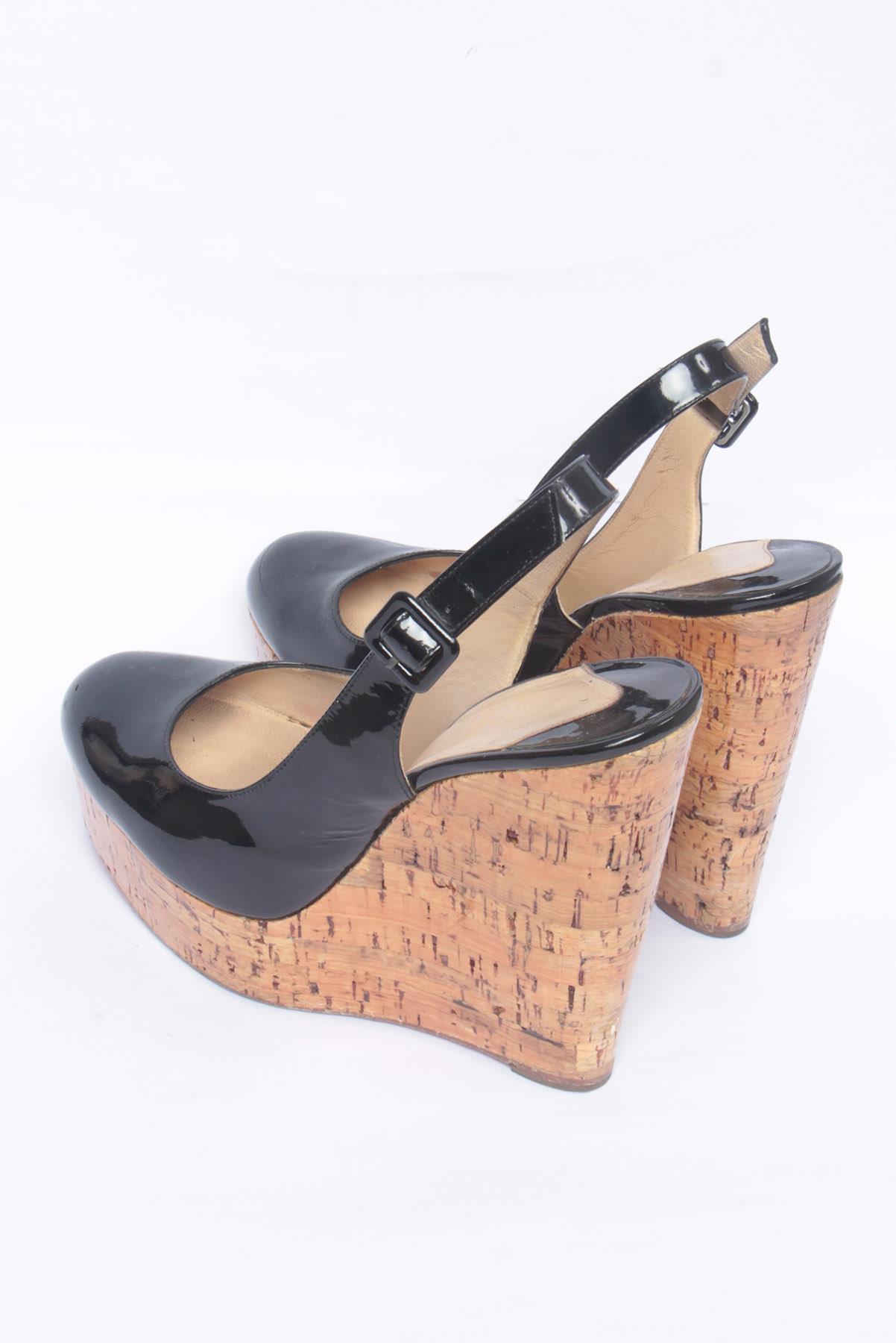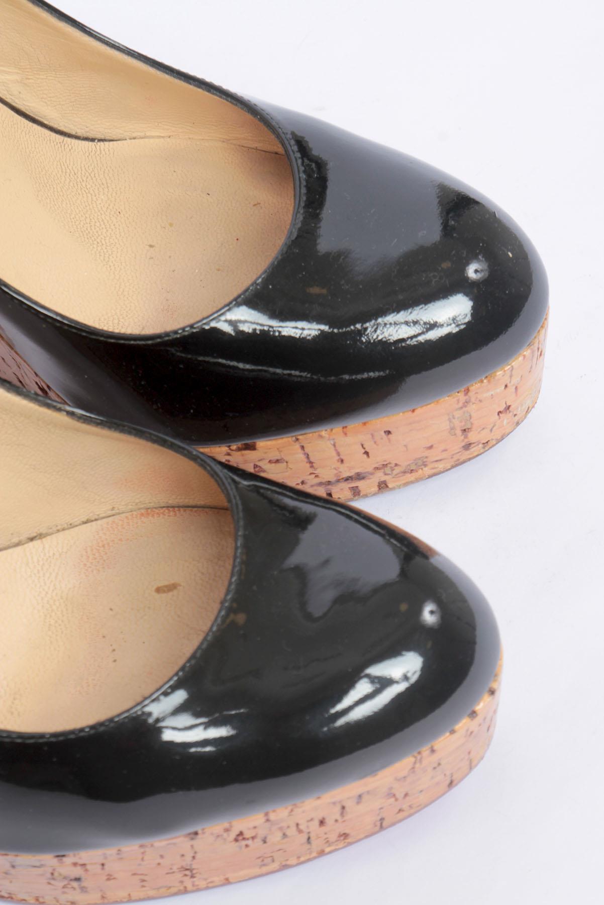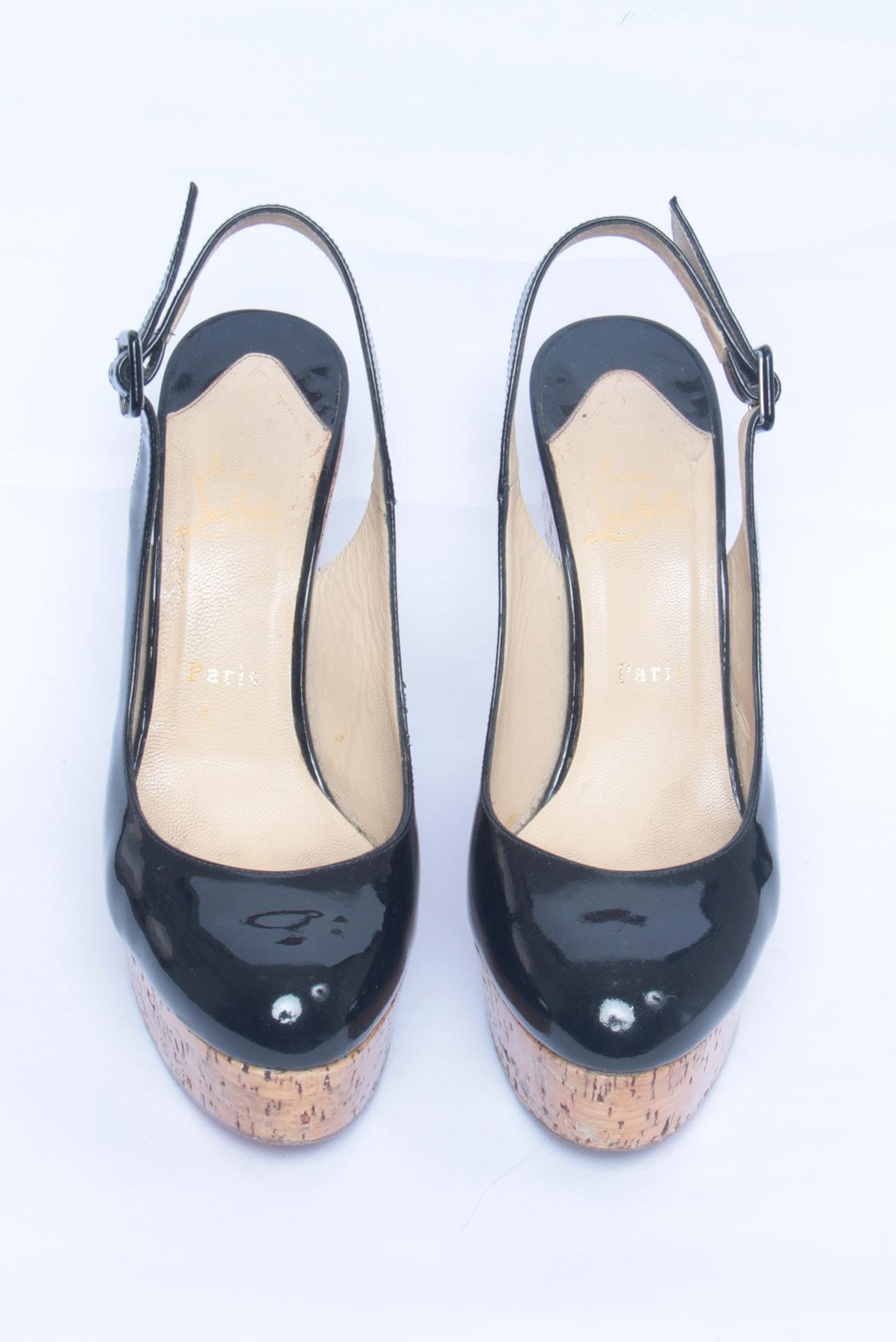 - Sapato em couro e cortiça- Preto envernizado e amêndoa- Bico arredondado frontal- Tira posterior com fivela para regulagem- Salto Anabela amplo- Solado em couro vermelho com marcas de uso