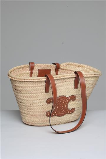Bolsa Celine Triomphe Tote Palha Logotipo Cravejado Marrom