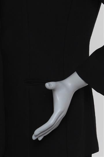 - Decote alongado em 'V' com lapelas duplas clássicas