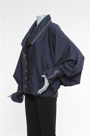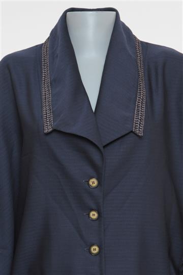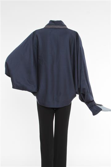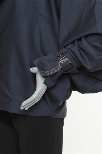 - Punhos alongados com fenda lateral e detalhe decorativo