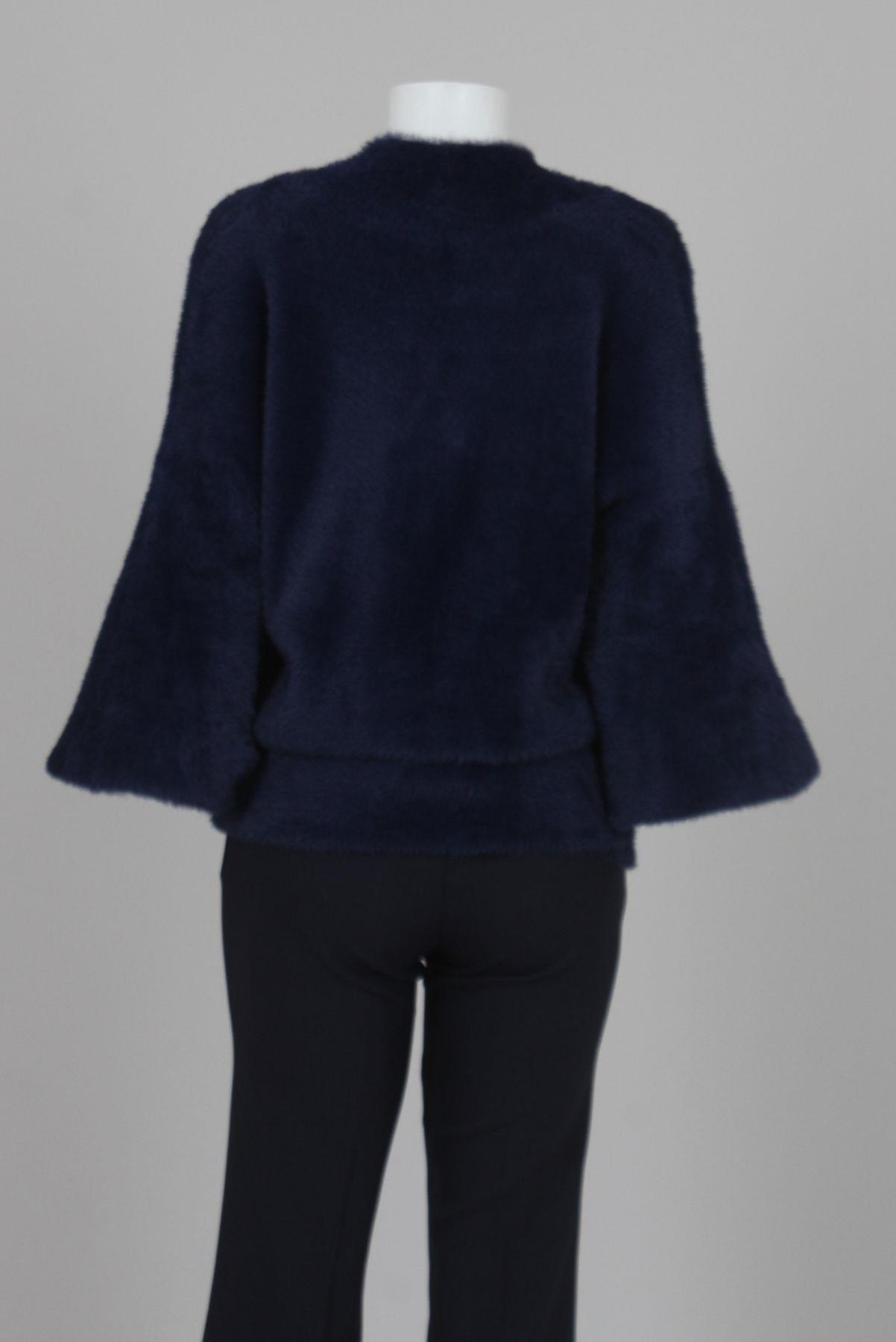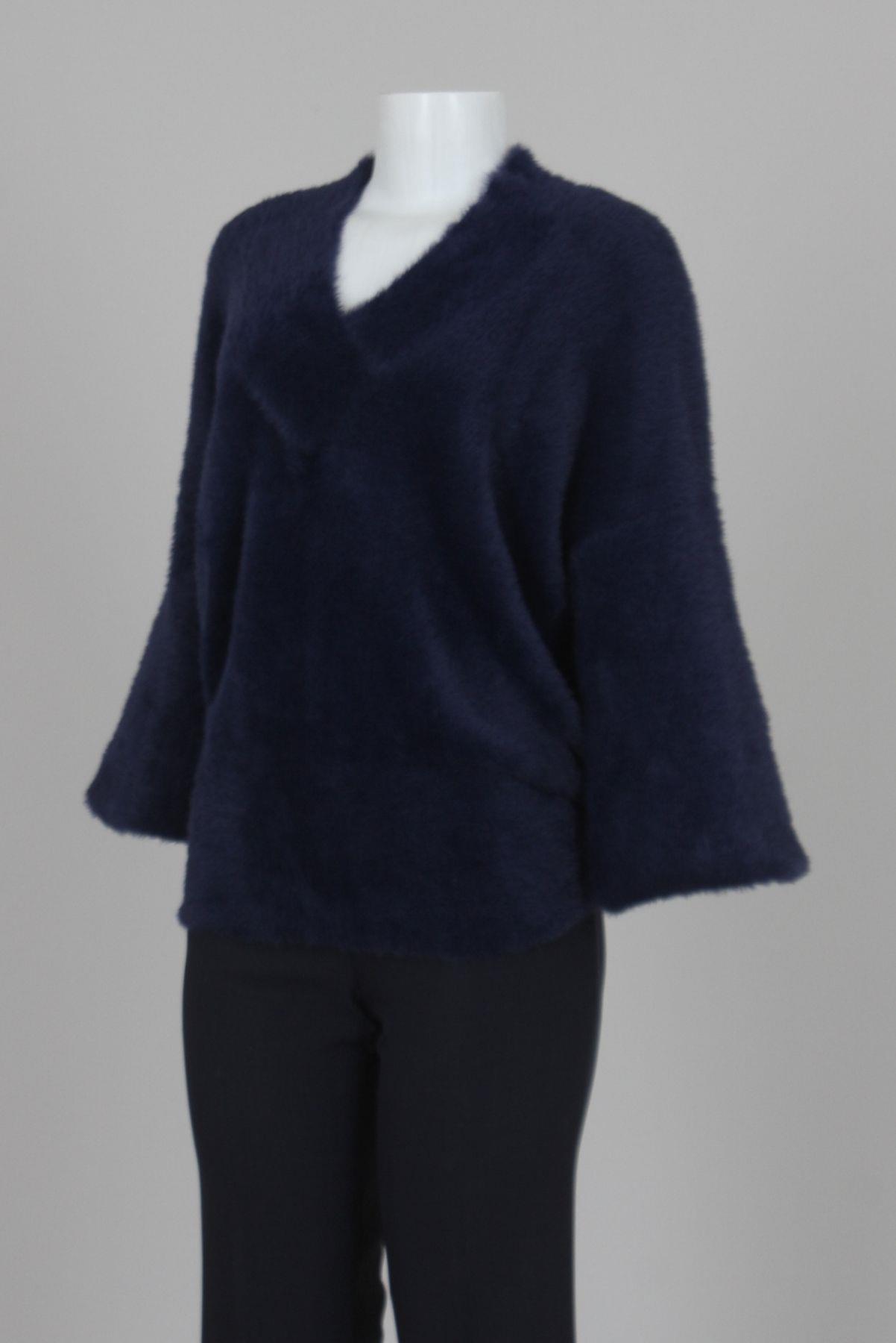 - Suéter em poliamida- Azul marinho- Modelagem ampla- Decote em 'V' transpassado- Mangas longas bufantes com punho justo.