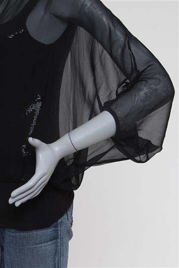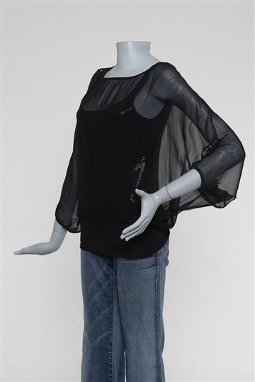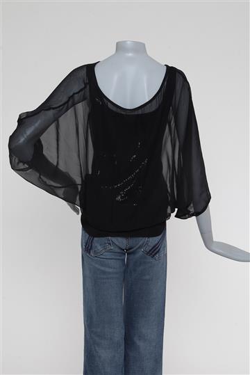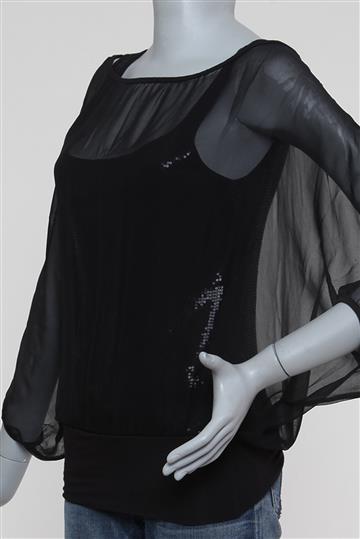 - Blusa em malha revestida por paetês com sobreposição em seda- Preto total com sutil brilho- Modelagem ajustada ao corpo- Decote arredondado amplo- Alças medianas sem regulagem- Sobreposição ampla com decote arredondado- Mangas morcego amplas- Comprimento regular