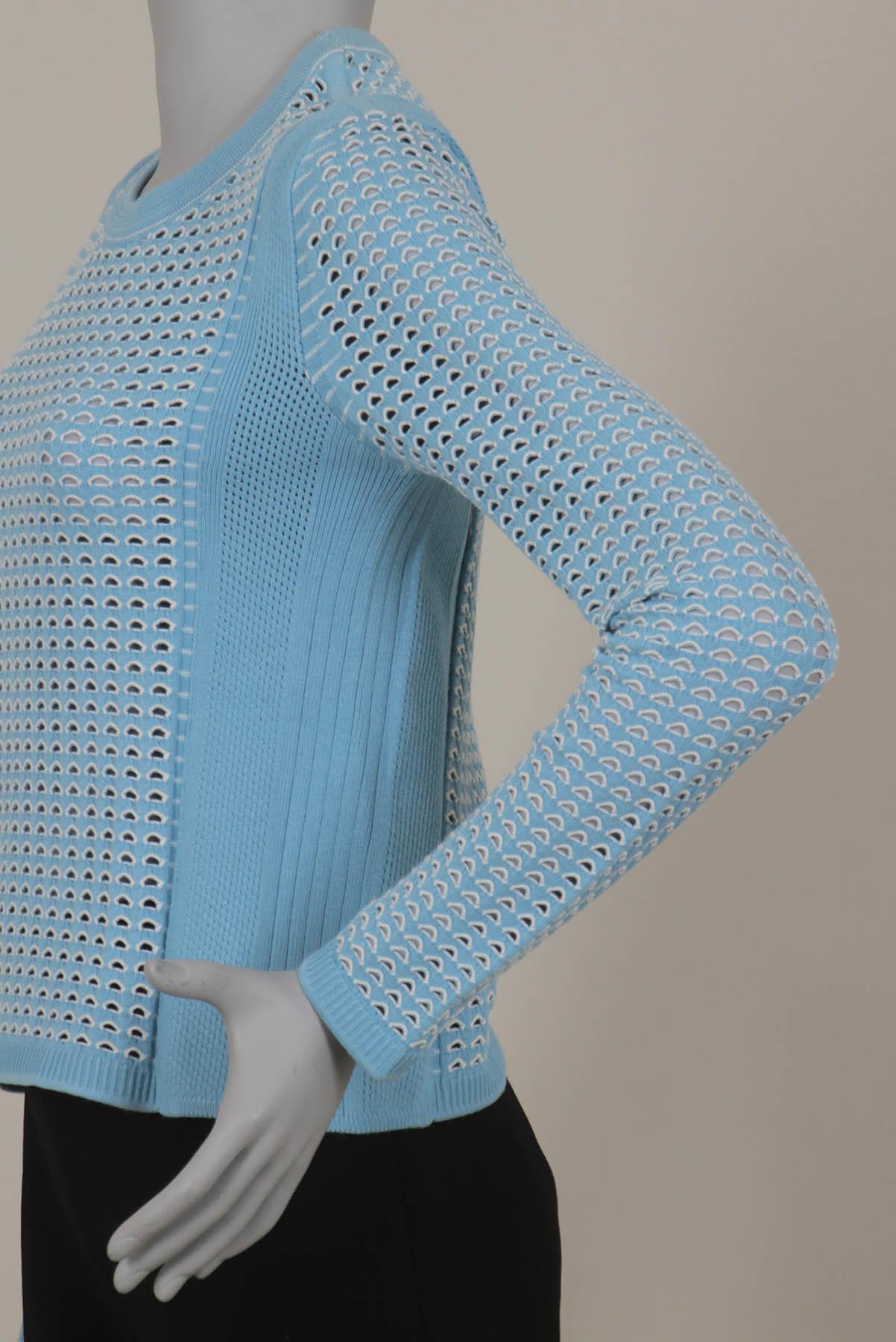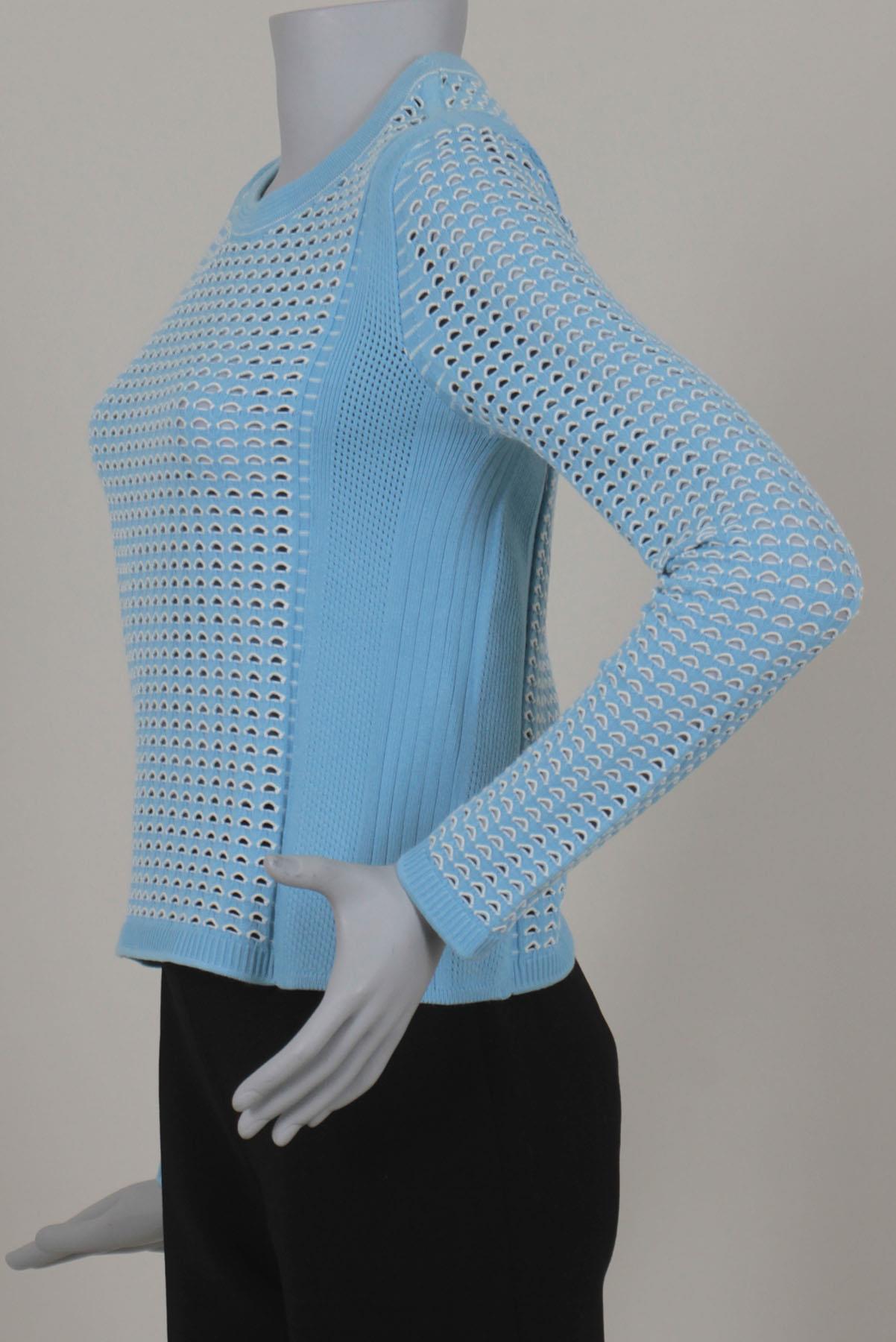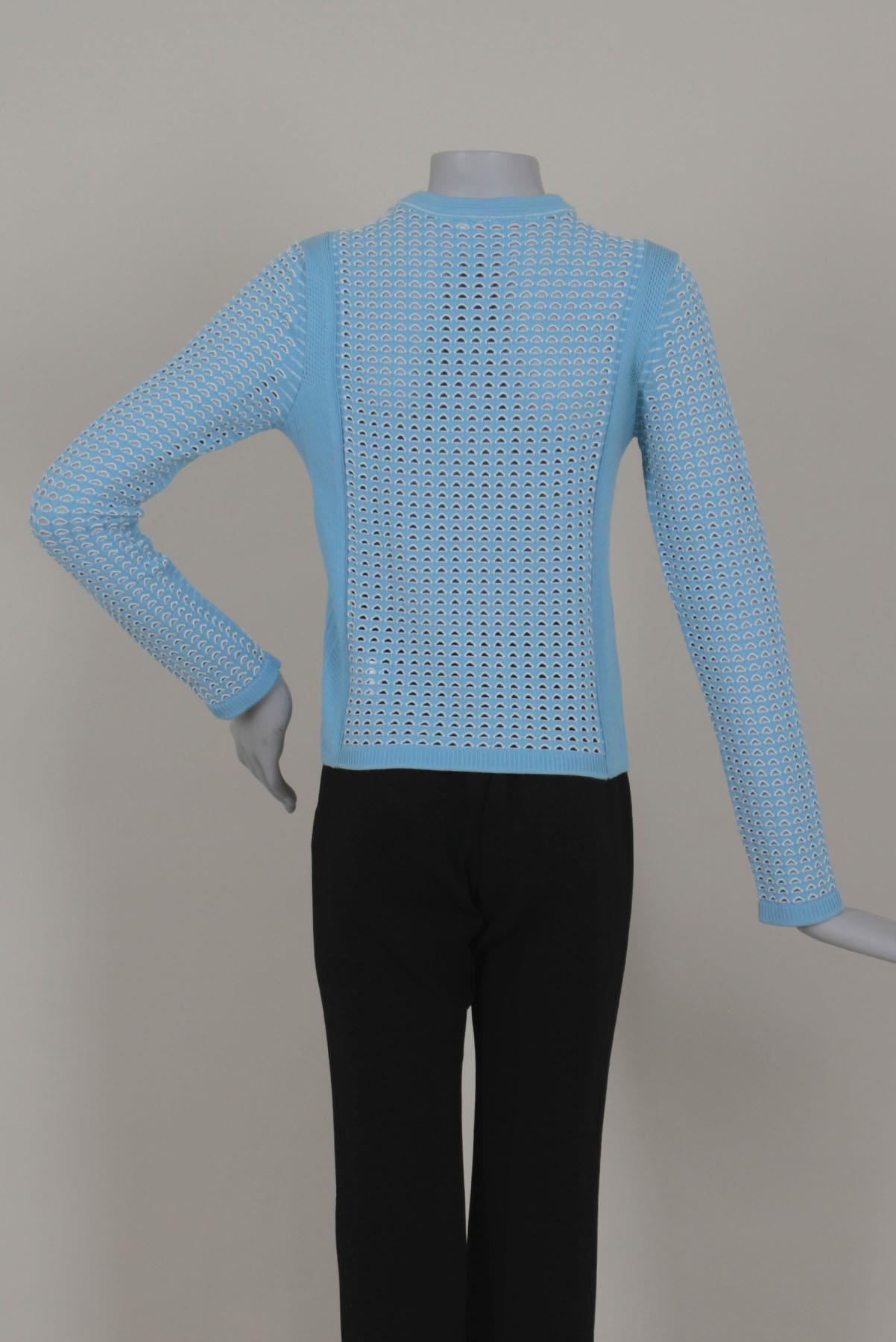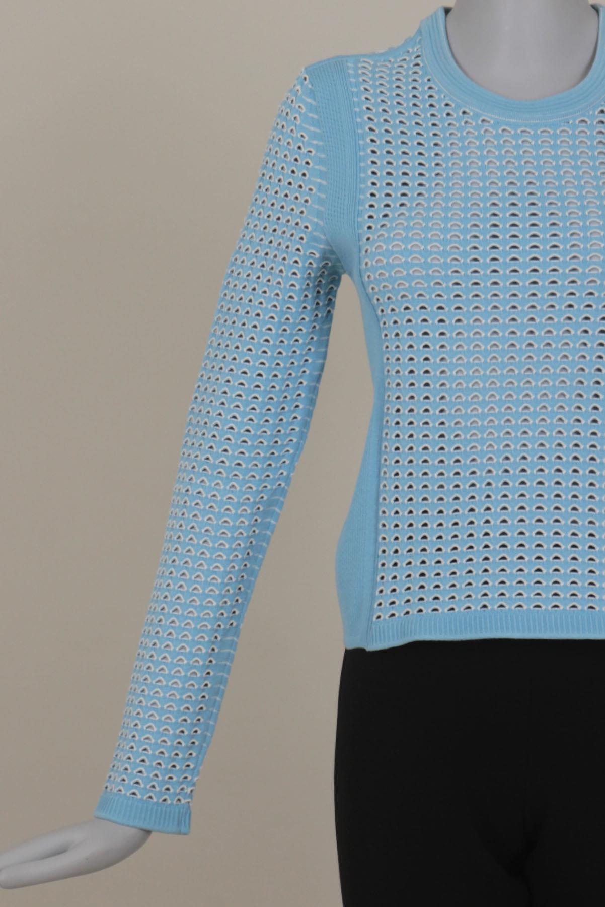 - Blusa em tricô- Azul claro e off white- Textura decorativa com leve transparência- Modelagem justa ao corpo- Decote arredondado- Mangas longas- Comprimento regular.