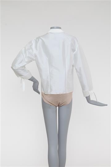 - Mangas 3/4 retas com punhos estruturados e amarração lateral