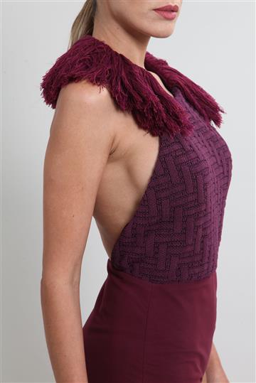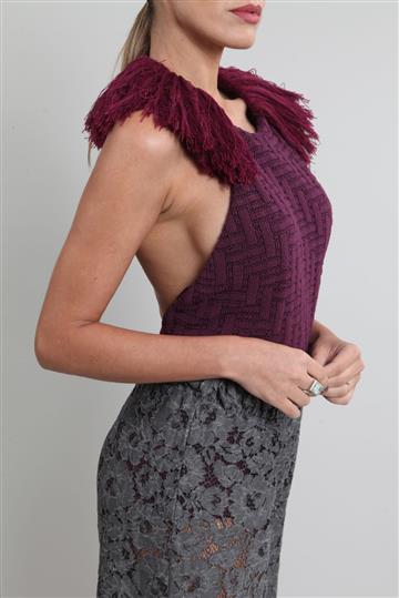 - Decote arredondado alto com alça elástica revestida por franjas
