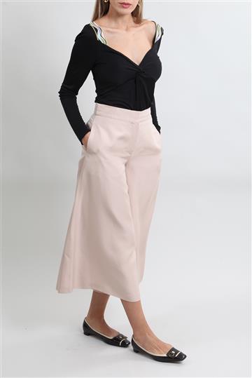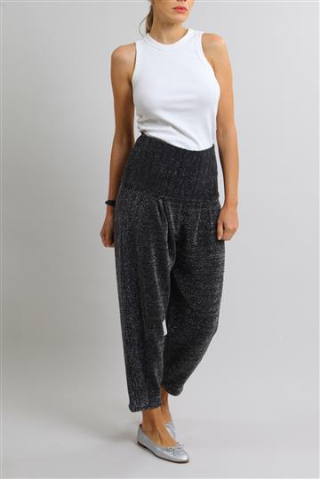 - Calça em tecido felpado de toque macio com fios de lurex aplicados à trama
