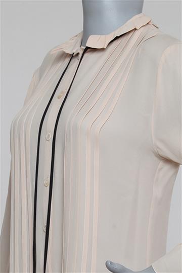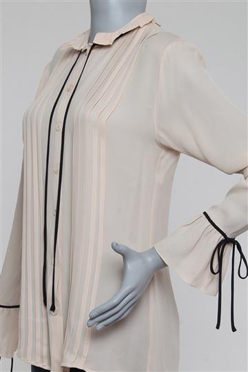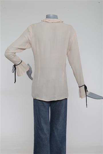 - Mangas longas com amarração delicada inferior e punhos fluidos pregueados