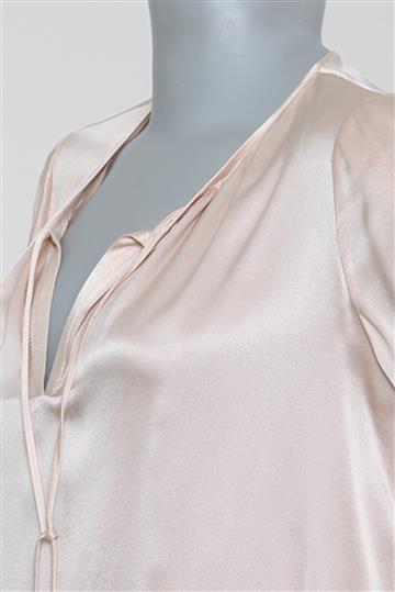 - Decote arredondado com abertura frontal em 'V' e cordão alongado para amarração