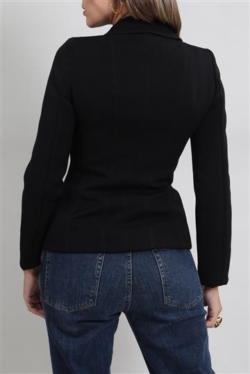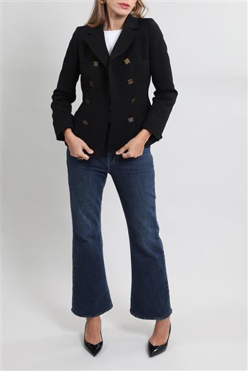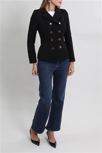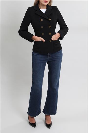 - Fechamento frontal por abotoamento duplo com botões metálicos quadrados