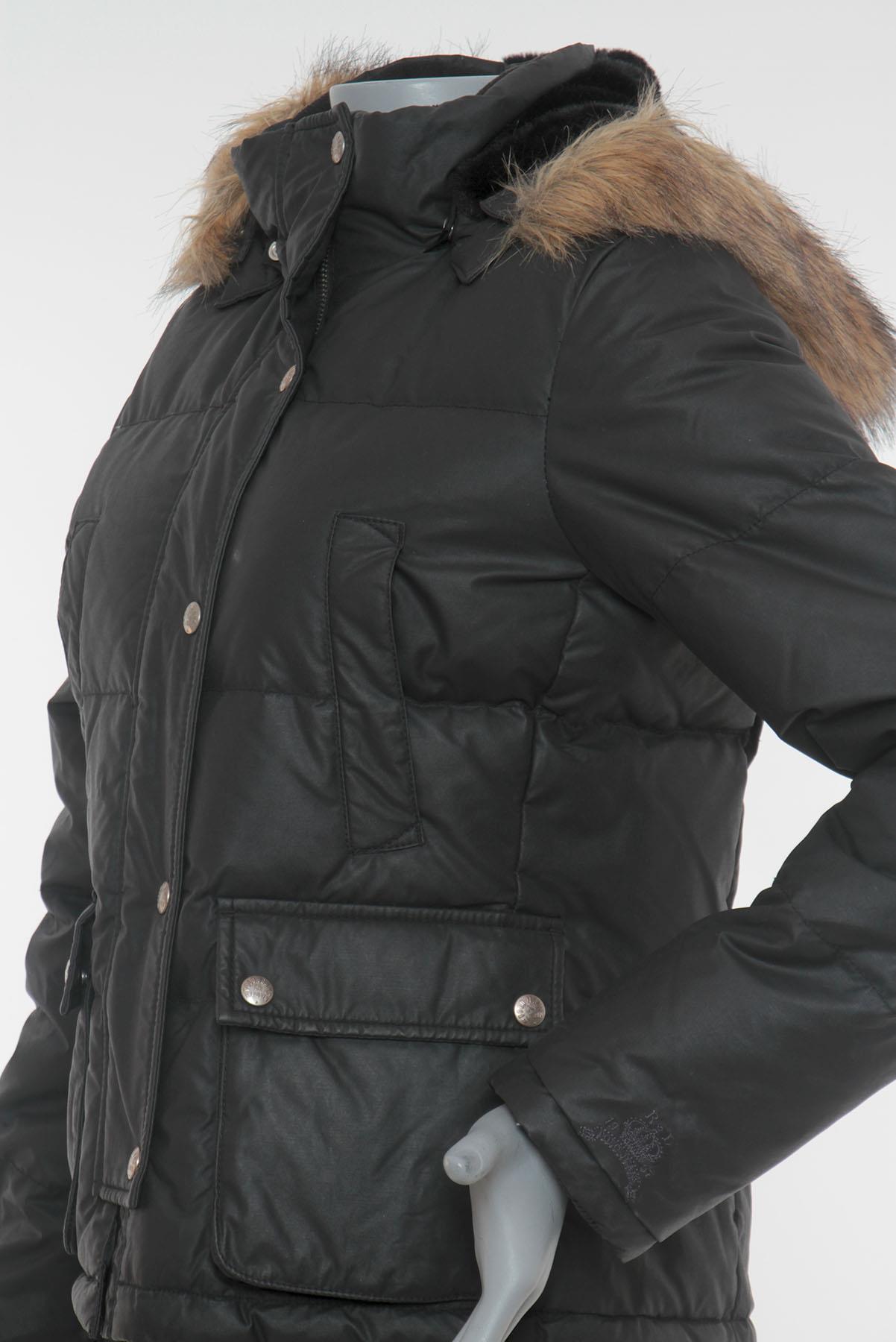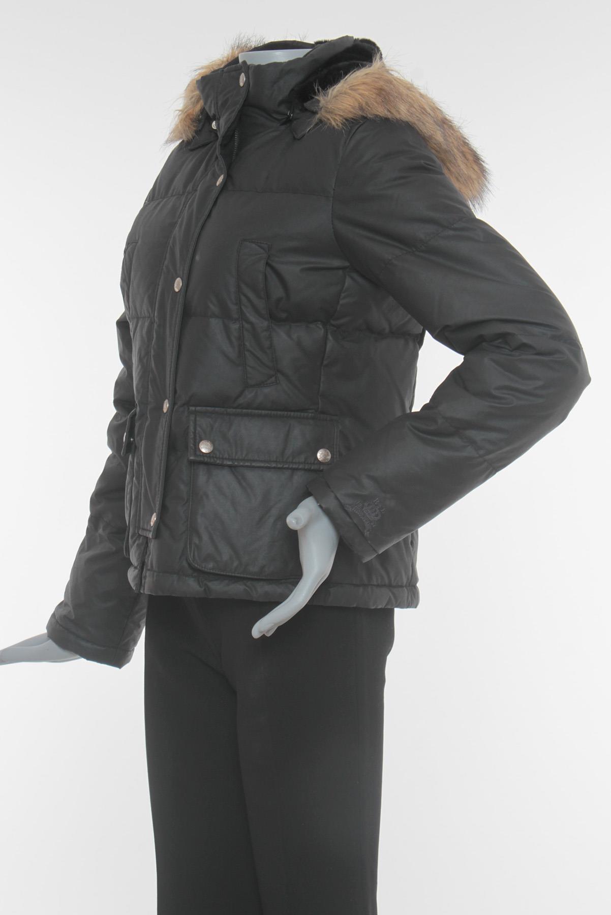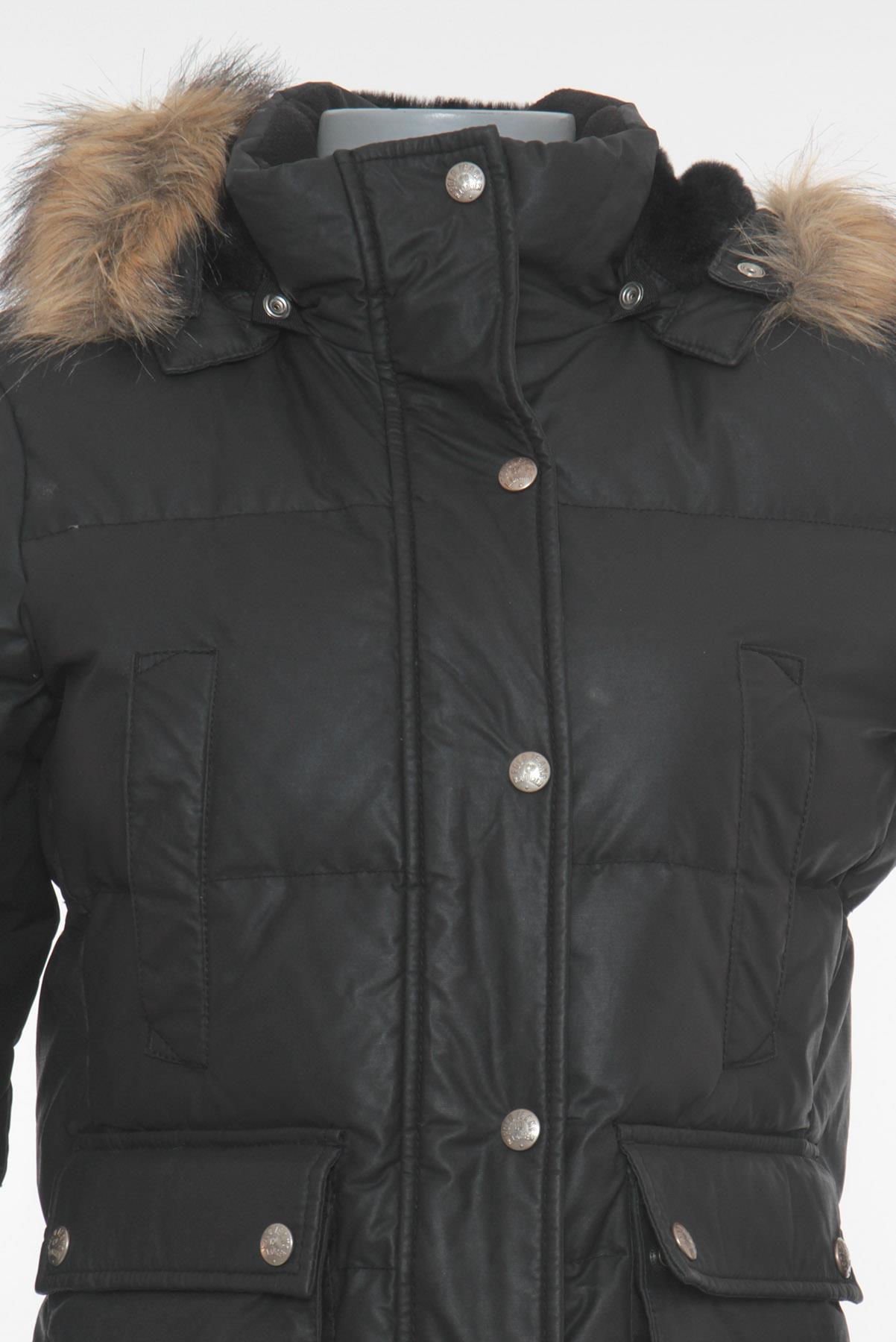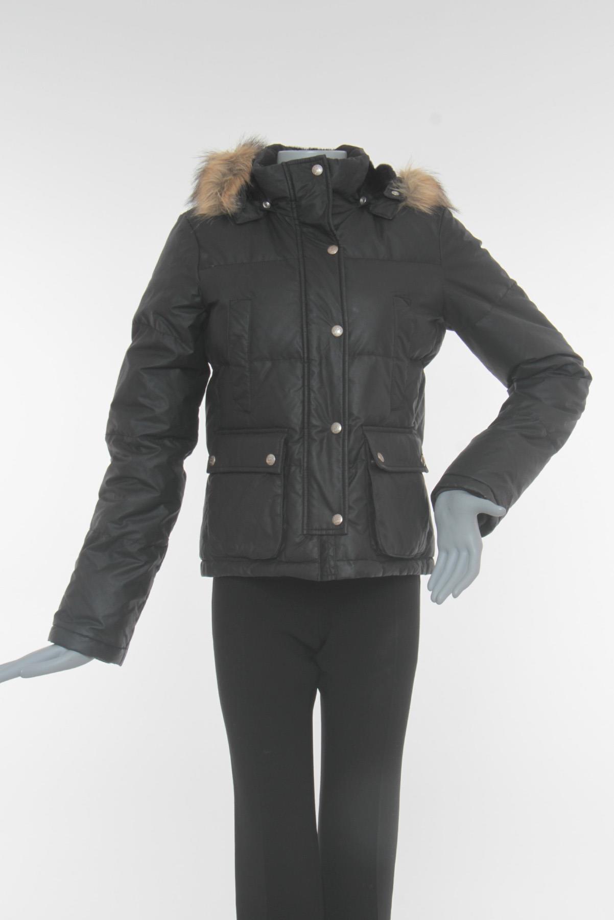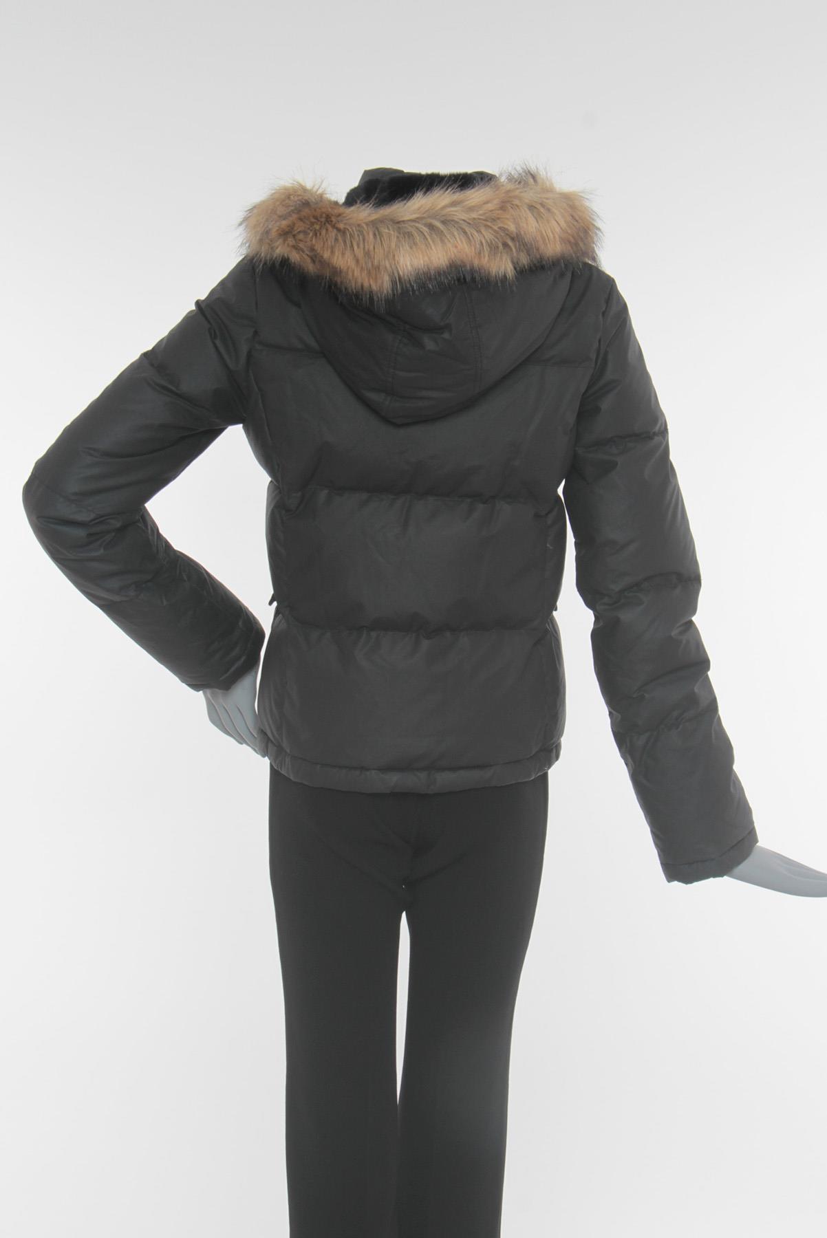 - Gola alta com capuz posterior removível e pelos aplicados