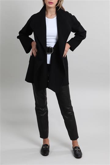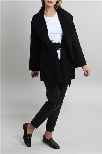- Abertura frontal alongada com lapelas assimétricas amplas