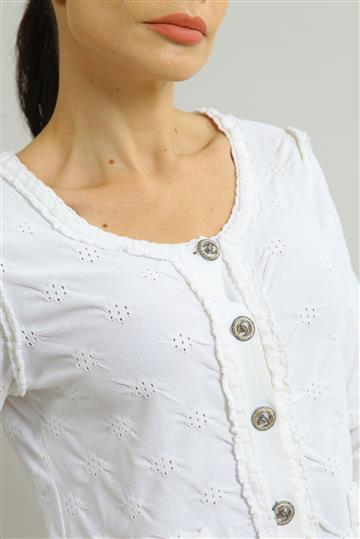 - Fechamento frontal por abotoamento com botões metálicos decorados