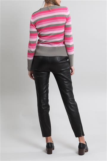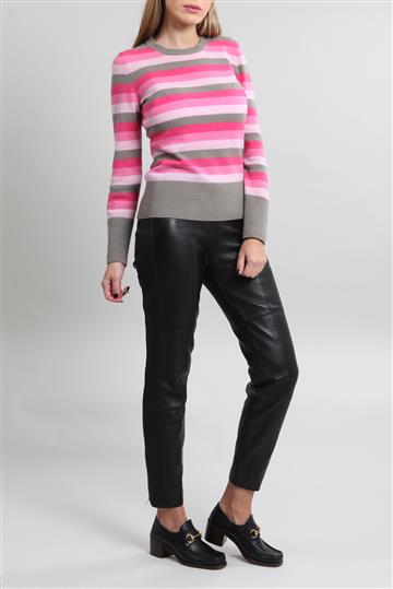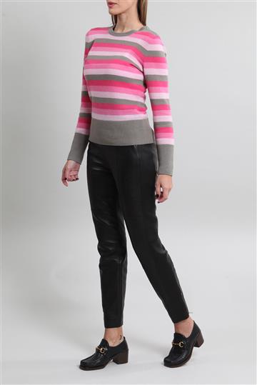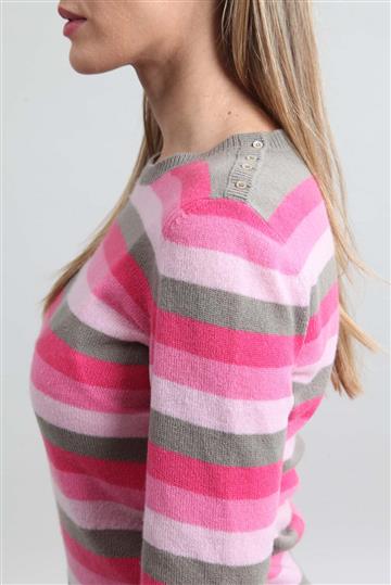 - Decote arredondado amplo com gola canelada de espessura mediana