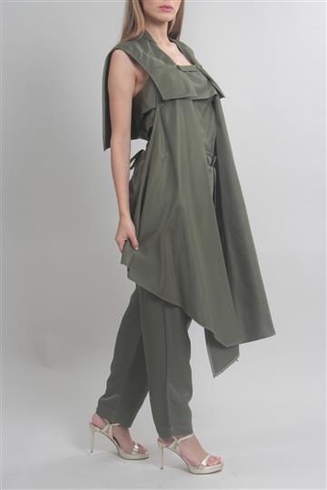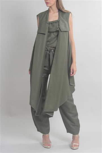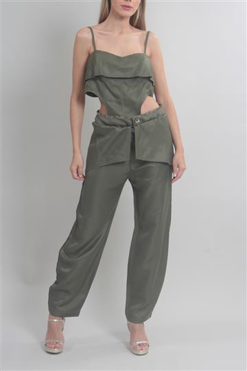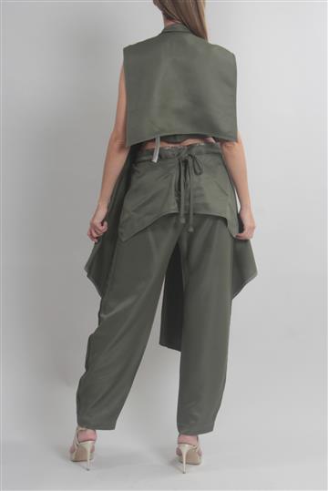 - Cintura alta com cós reto e pequeno cinto removível para melhor ajuste ao corpo