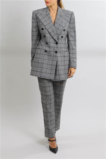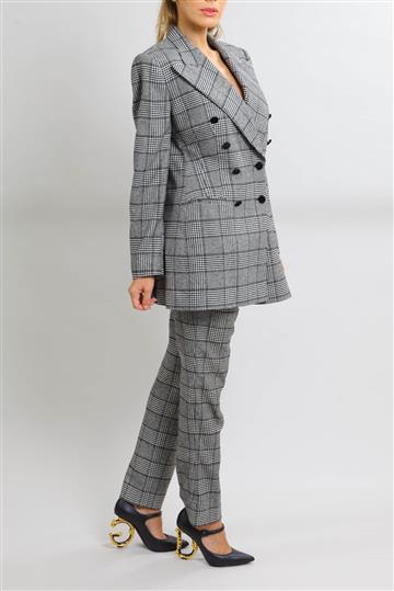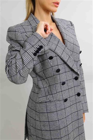 - Fechamento frontal por abotoamento duplo por botões forrados em veludo