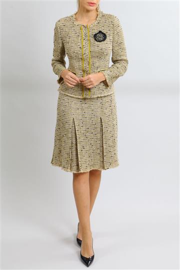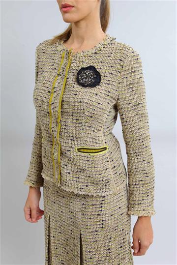 - Casaqueto possui modelagem reta e ligeiramente acinturada